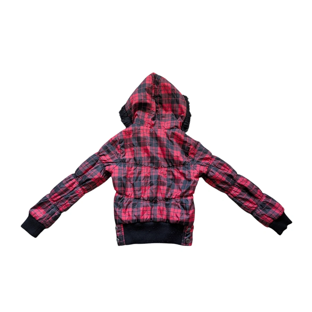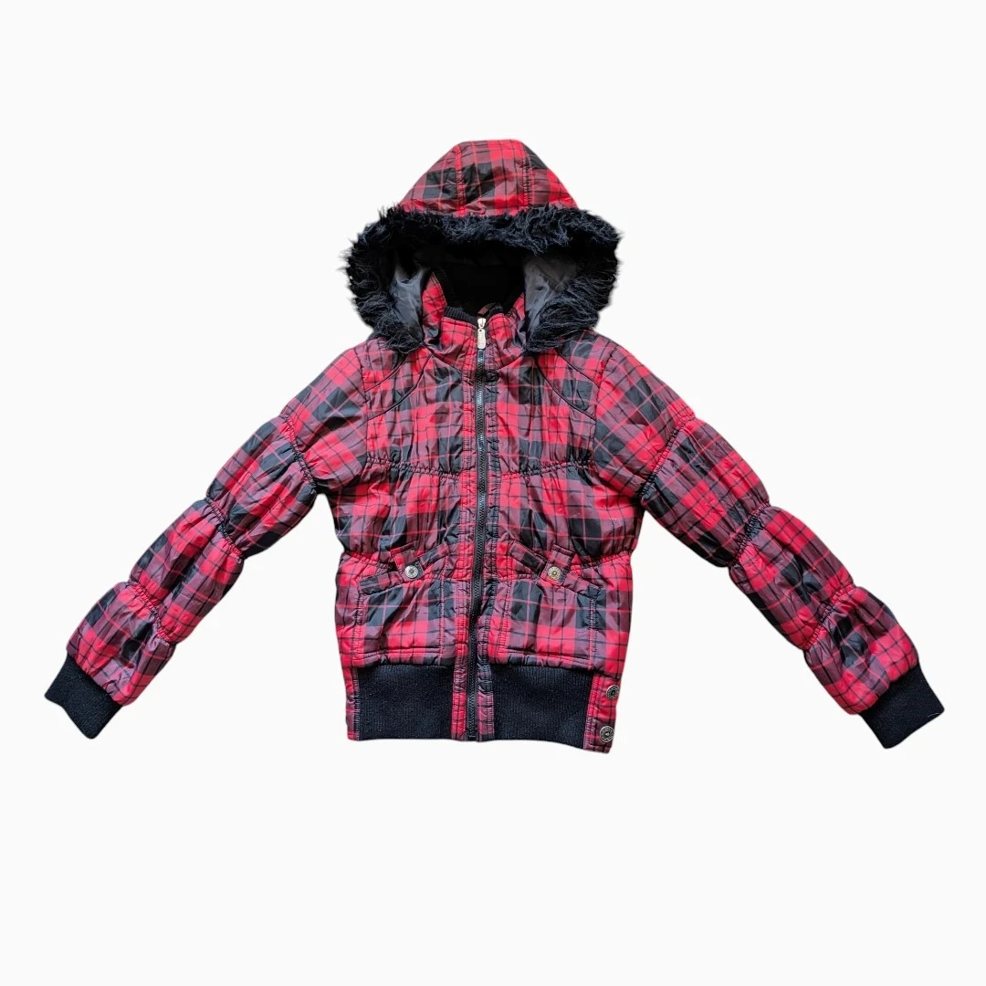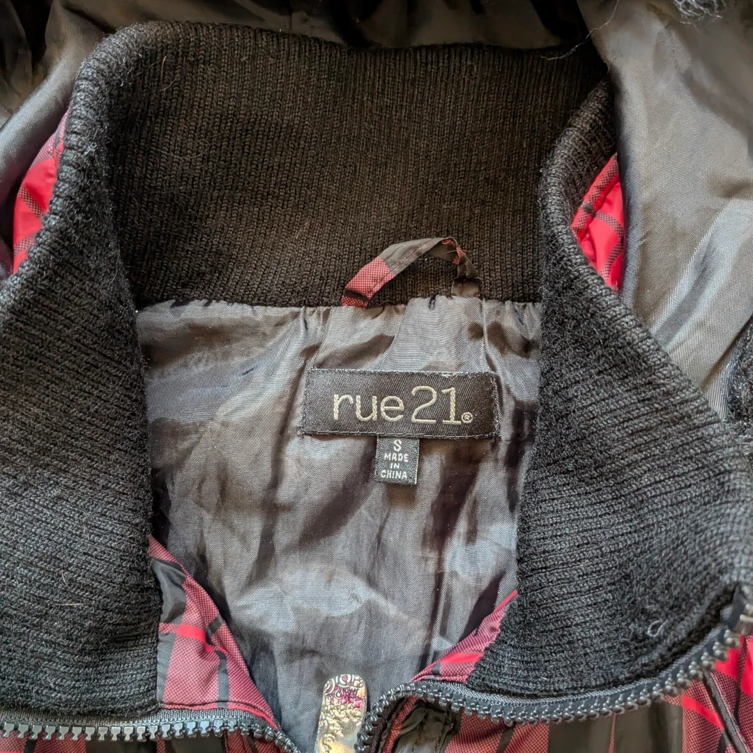 This Rue 21 puffer jacket features a red and black plaid pattern. It has a faux fur trimmed hood and ribbed cuffs. Size is small.