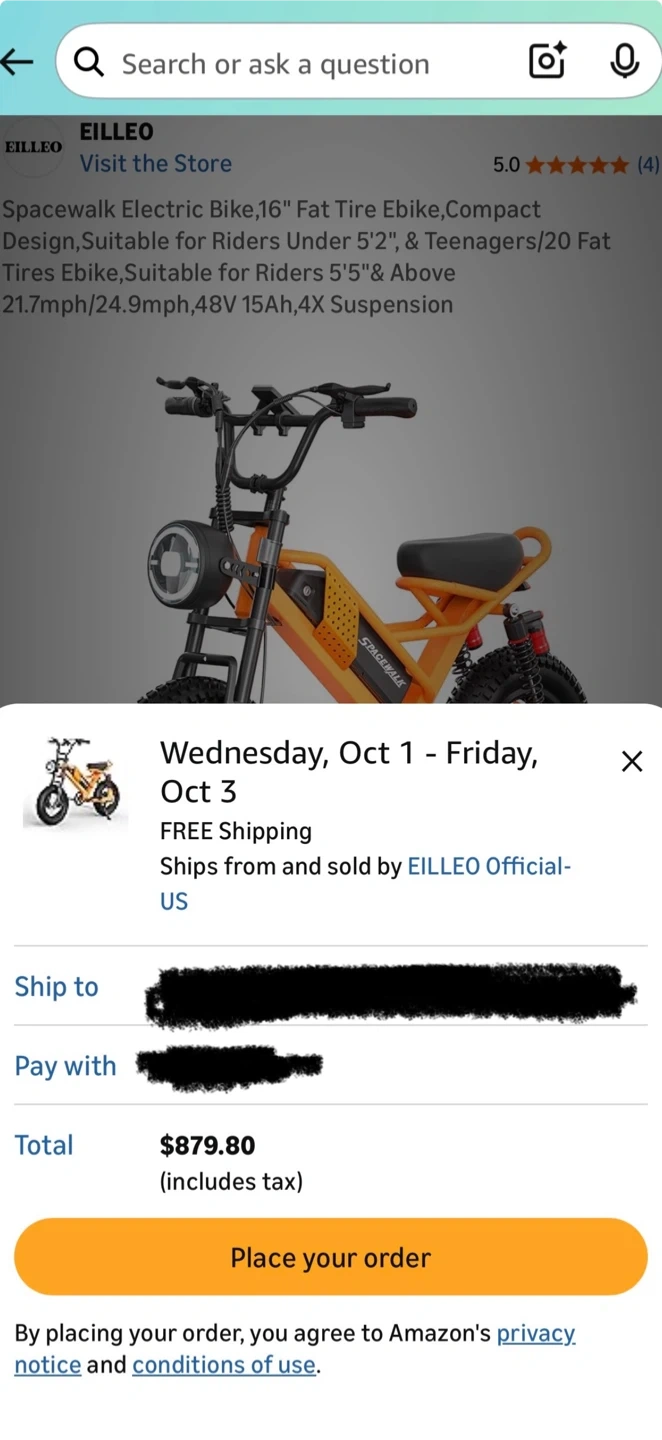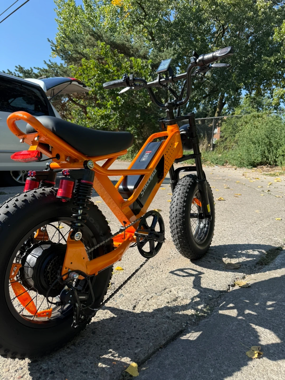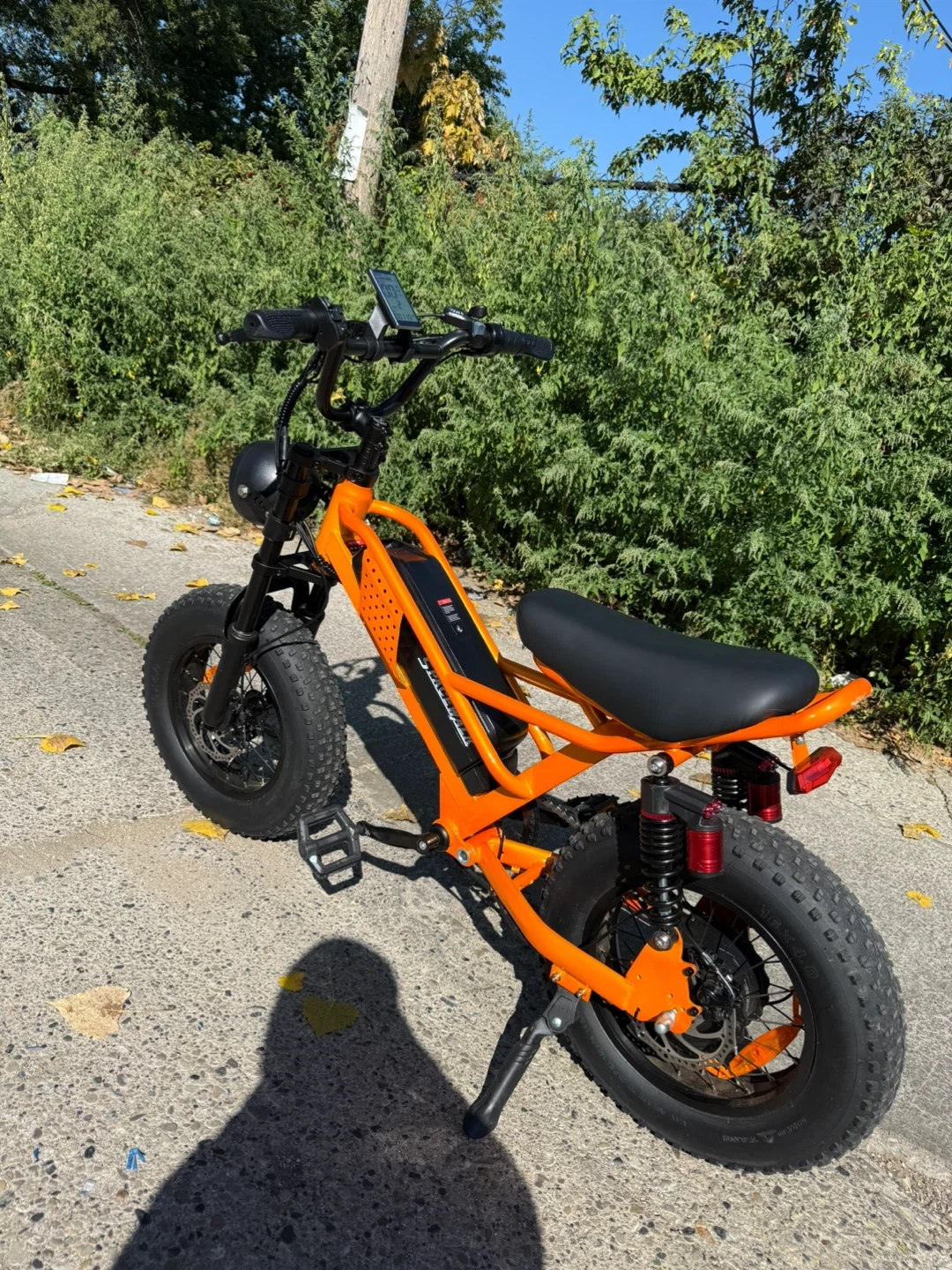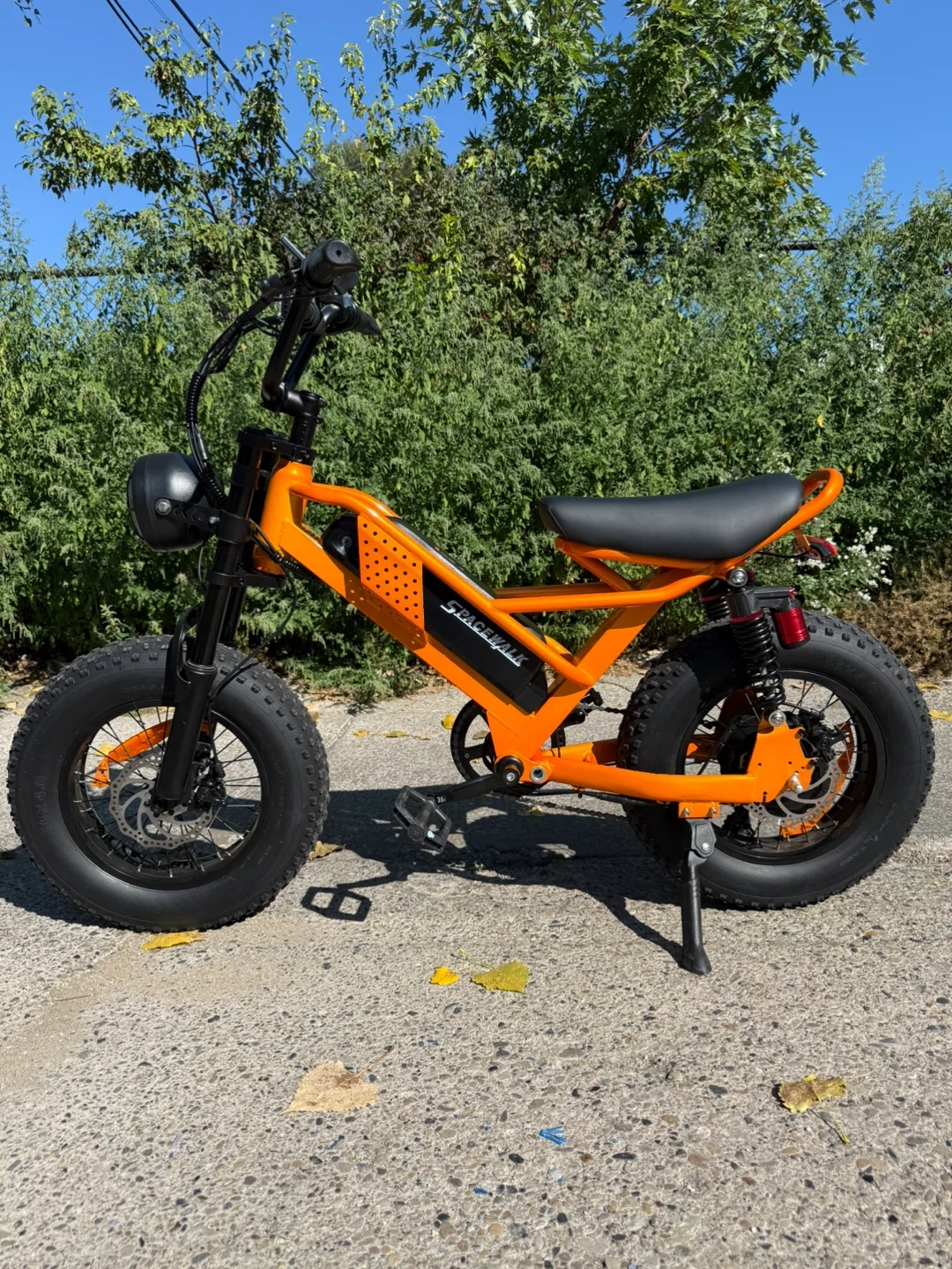 Selling a cool orange SpaceWalk electric bike! It's in great shape and ready for some fun rides. Check out the photos for details! Spacewalk e-bike very powerful and has less than 300 miles top speed 22 mph and range is 20-30 miles depending on weight bike is 16 inch and good for teens but adults can ride it. It runs perfectly has no problems has new brakes 550 or best offer plz don’t low ball me