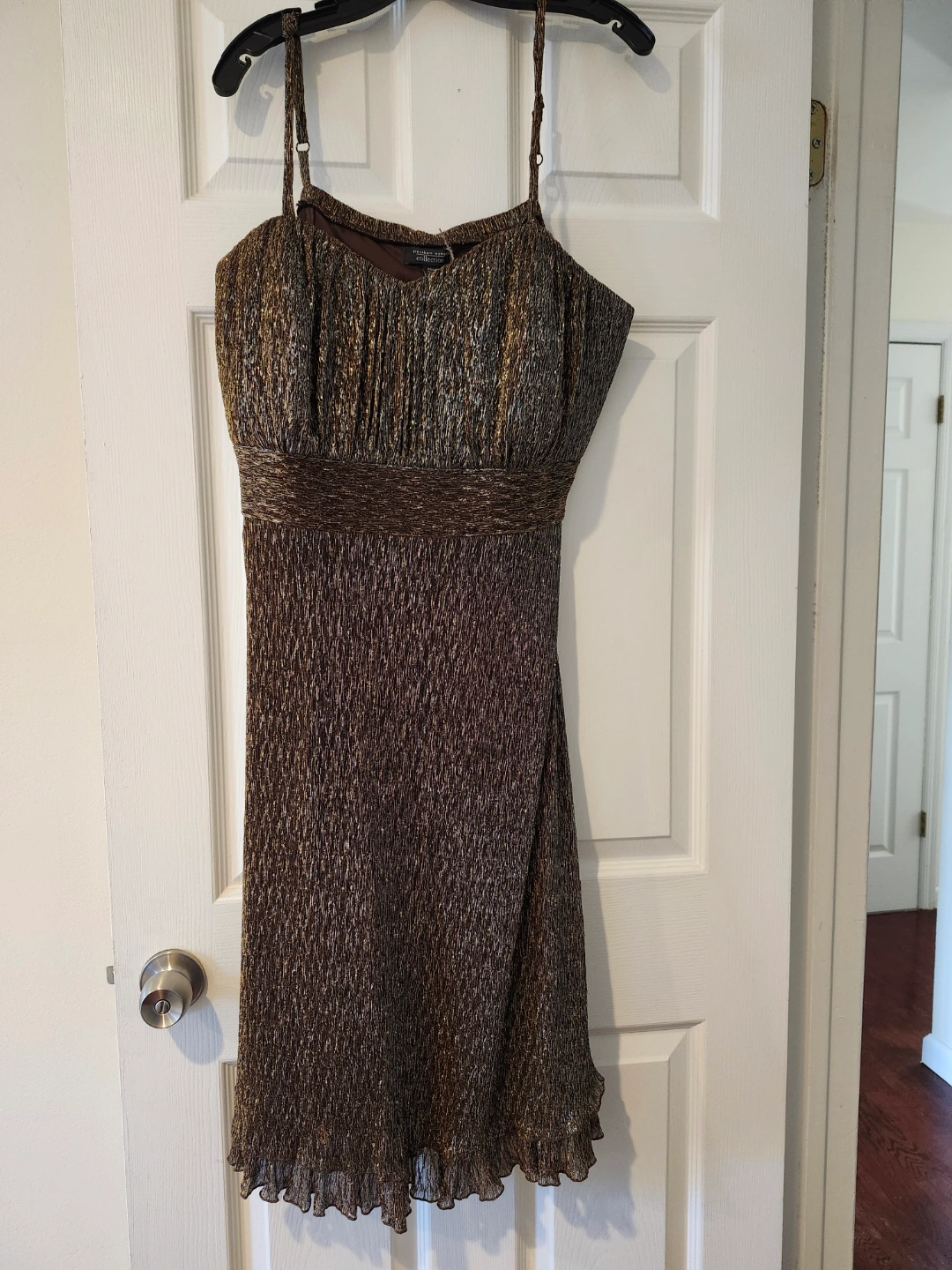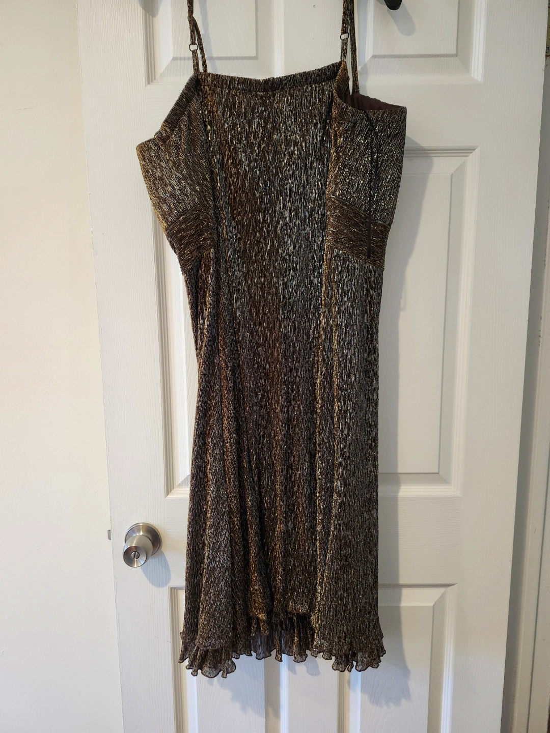 Beautiful sparkly brown and gold dress. Spaghetti straps. Pleated design. Short length. Looks great for a party.