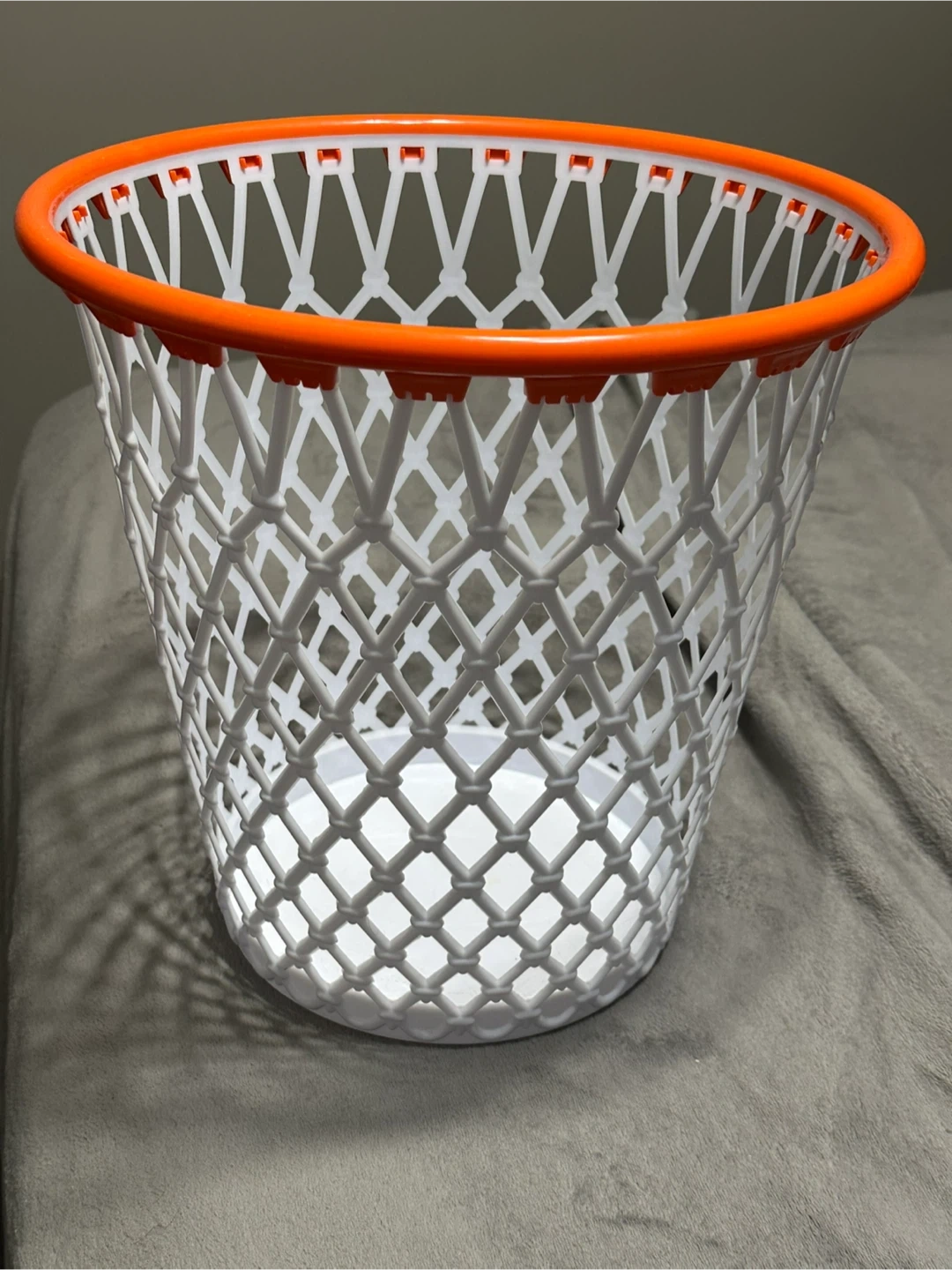 65This is a fun trash can shaped like a basketball hoop! It's white with an orange rim and is perfect for a kid's room or any basketball fan
