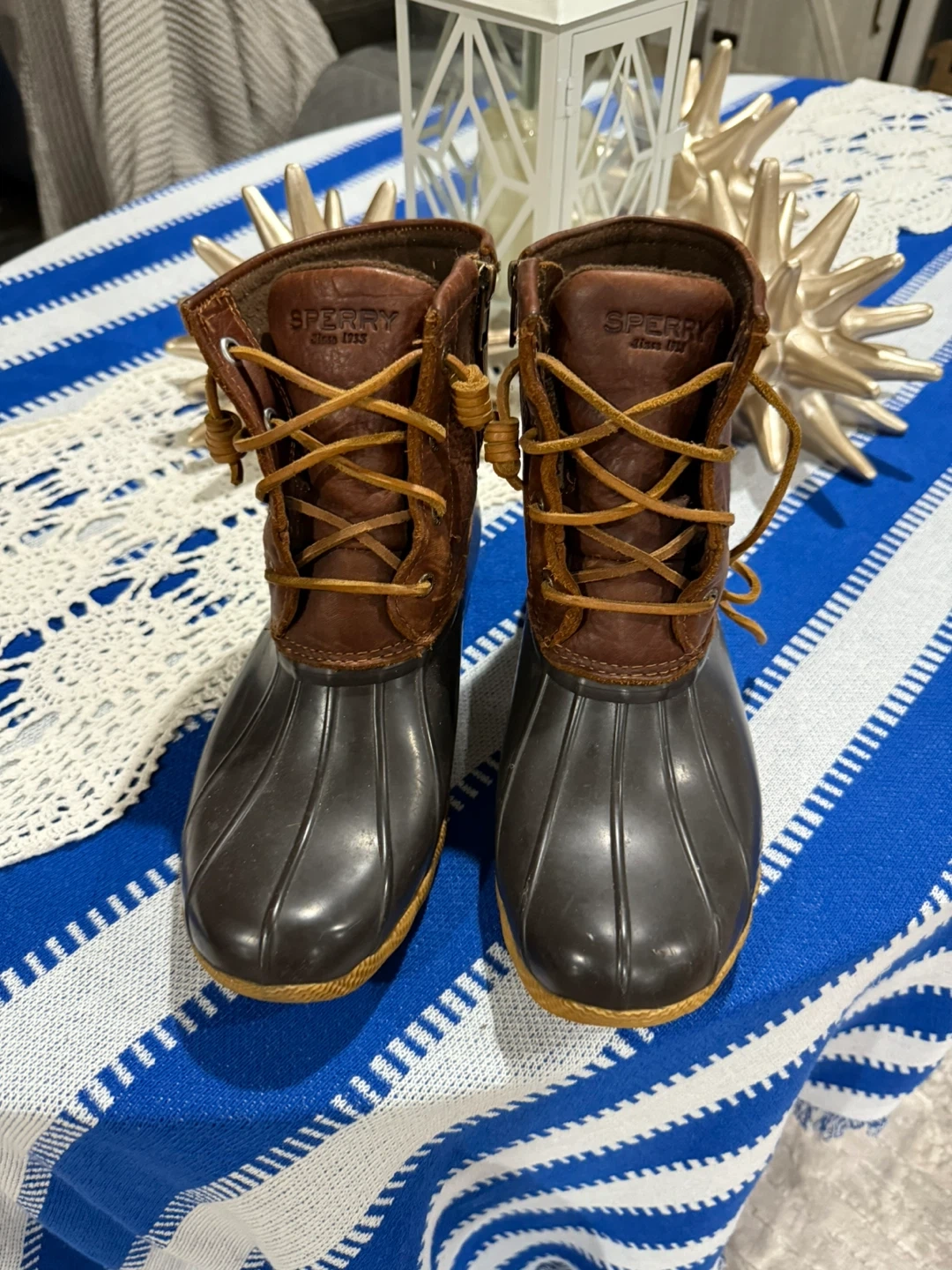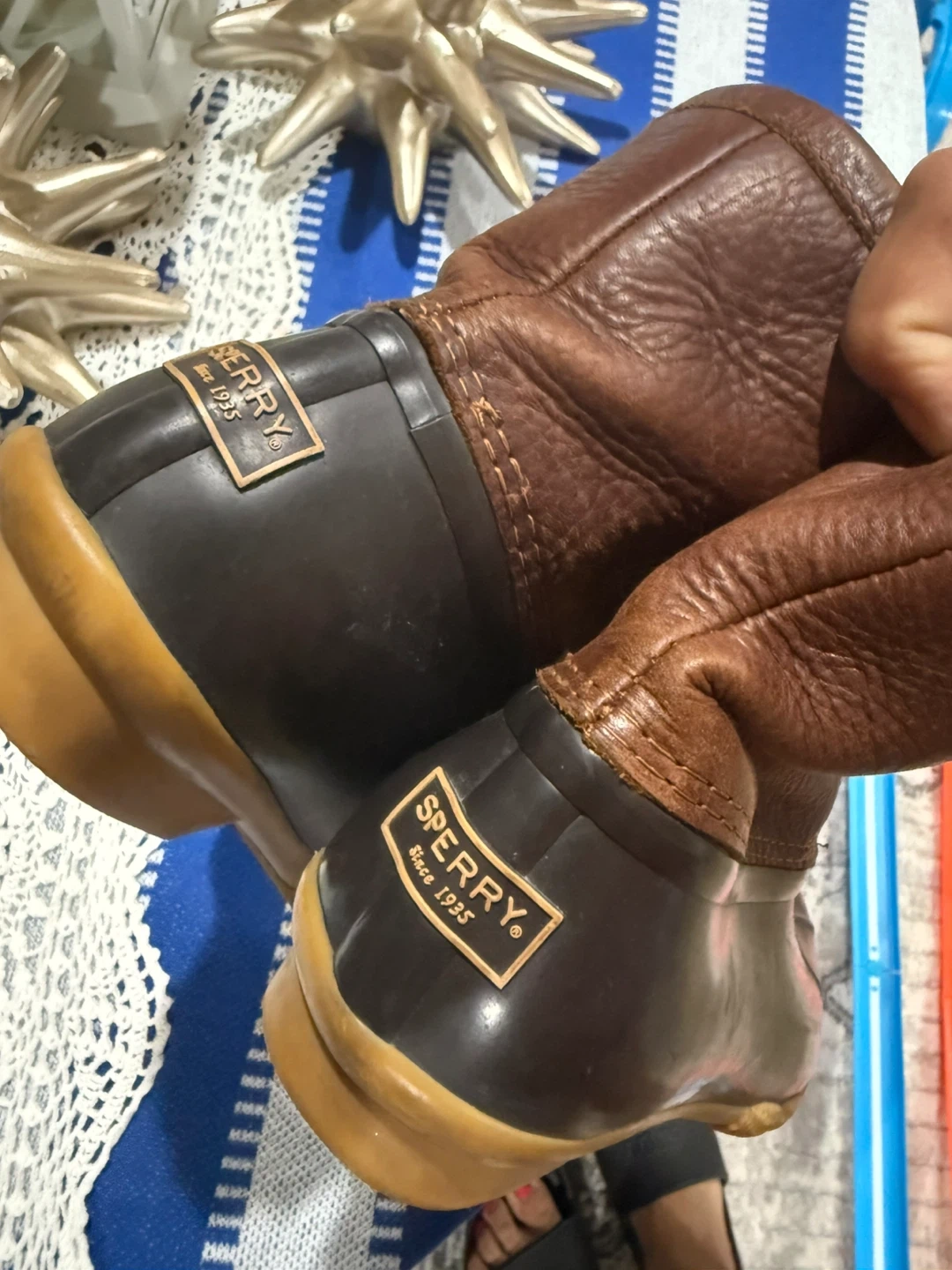 68Selling a pair of Sperry waterproof rubber boots in women's size 7M. These boots are perfect for keeping your feet dry and stylish in wet weather. They feature a classic design with leather and rubber construction.