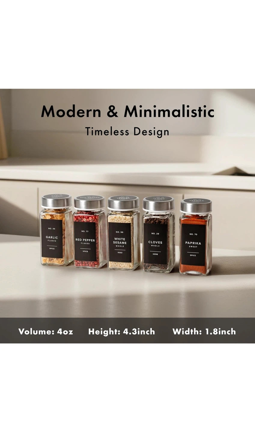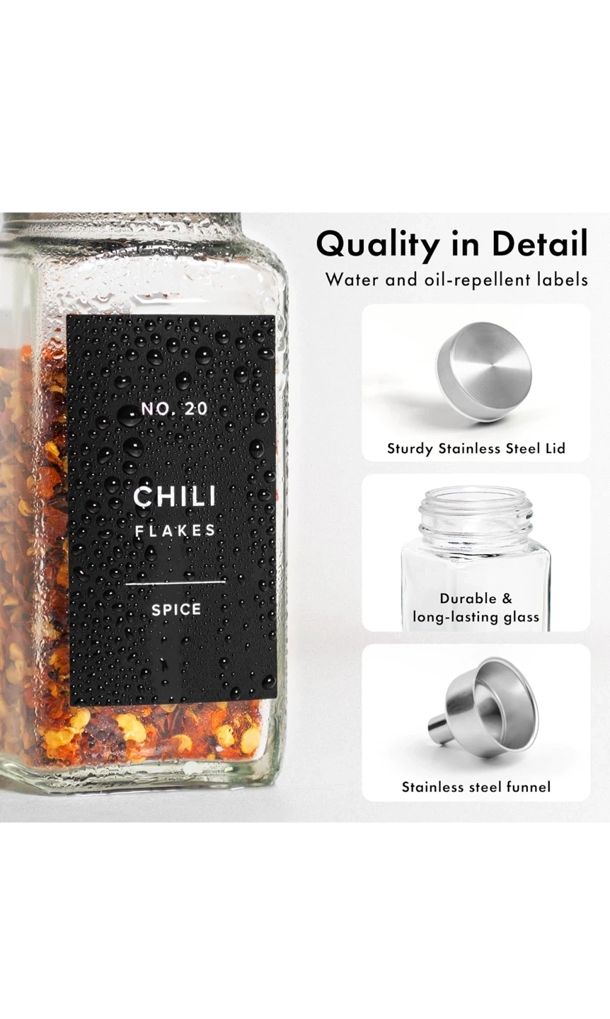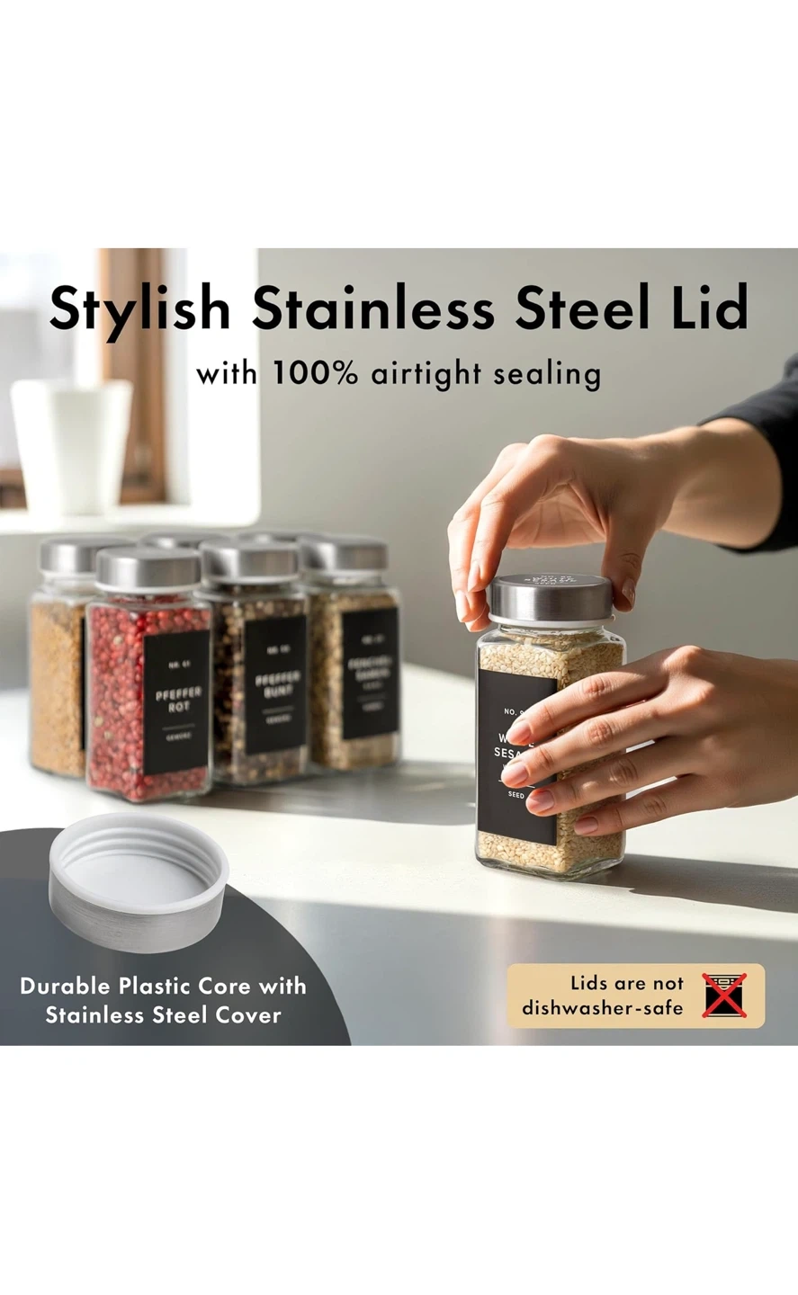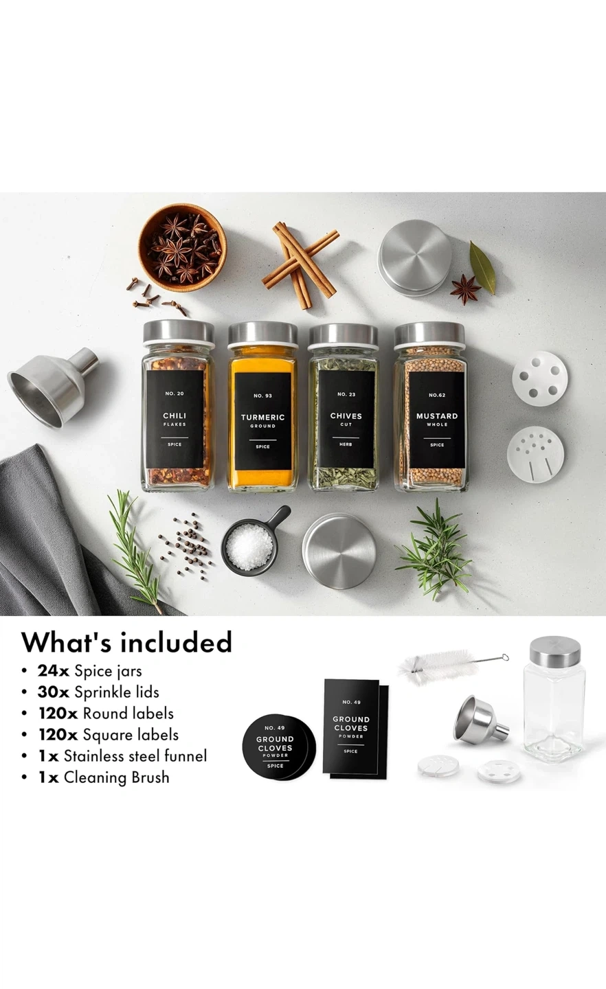 Organize your kitchen with these stylish spice jars! They come with stainless steel lids for an airtight seal. You'll get: - 24 spice jars - 30 sprinkle lids - 120 round labels - 120 square labels - 1 stainless steel funnel The labels are water and oil-repellent, so they'll stay looking great