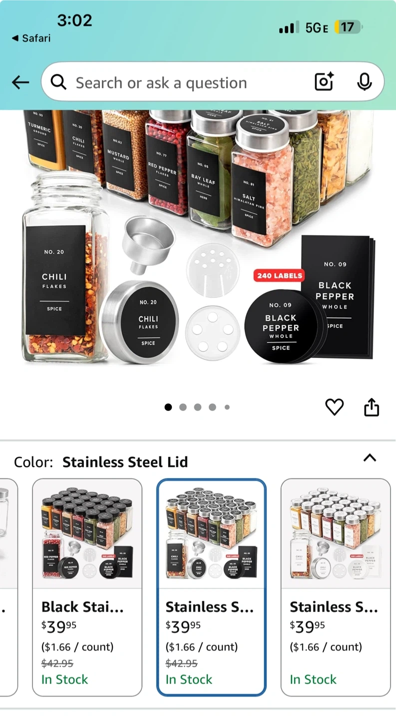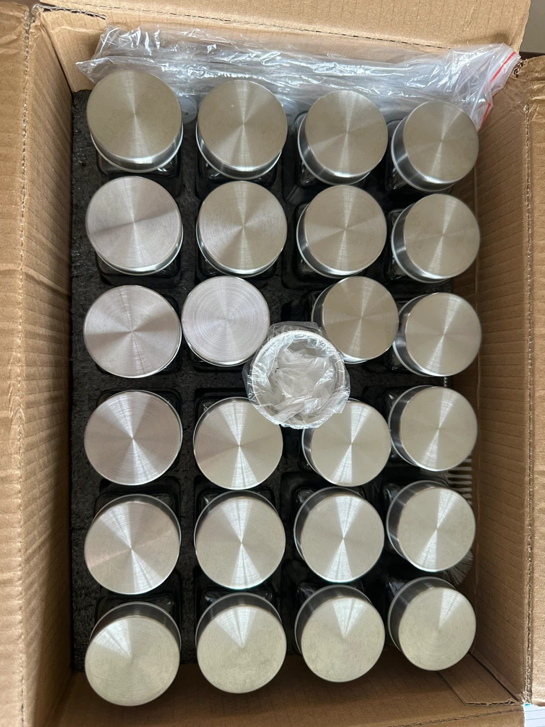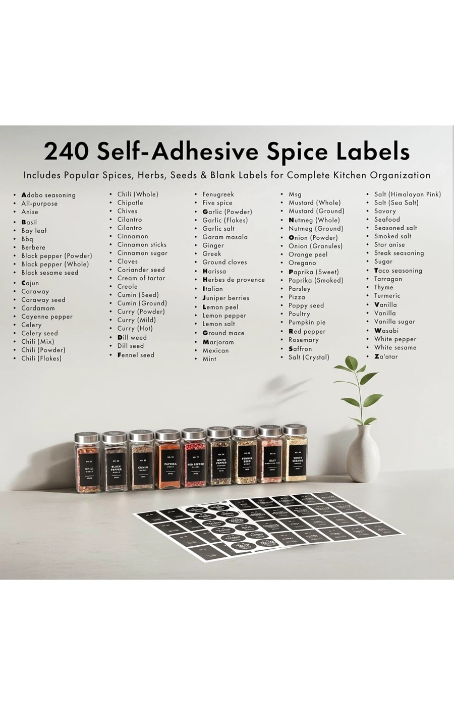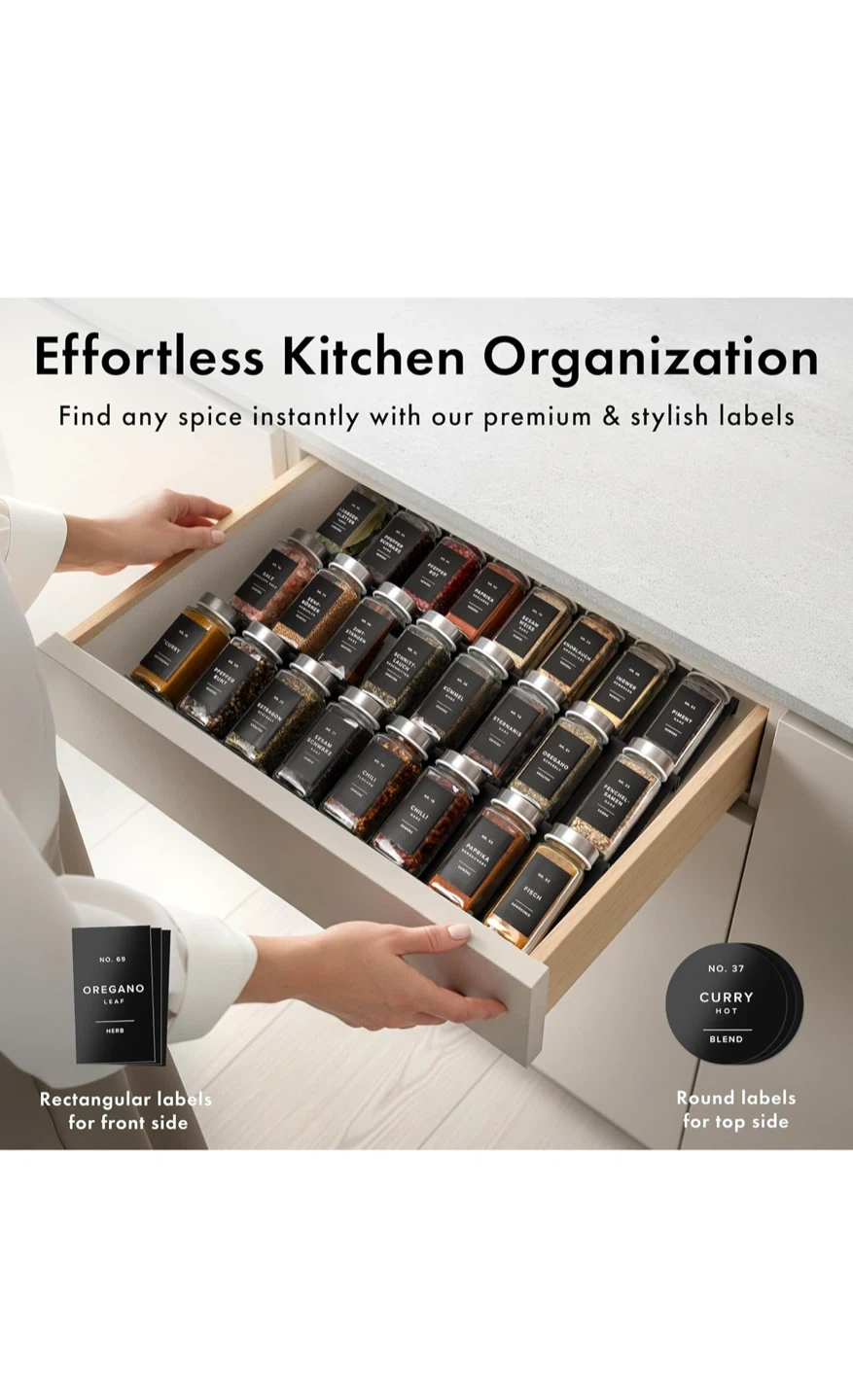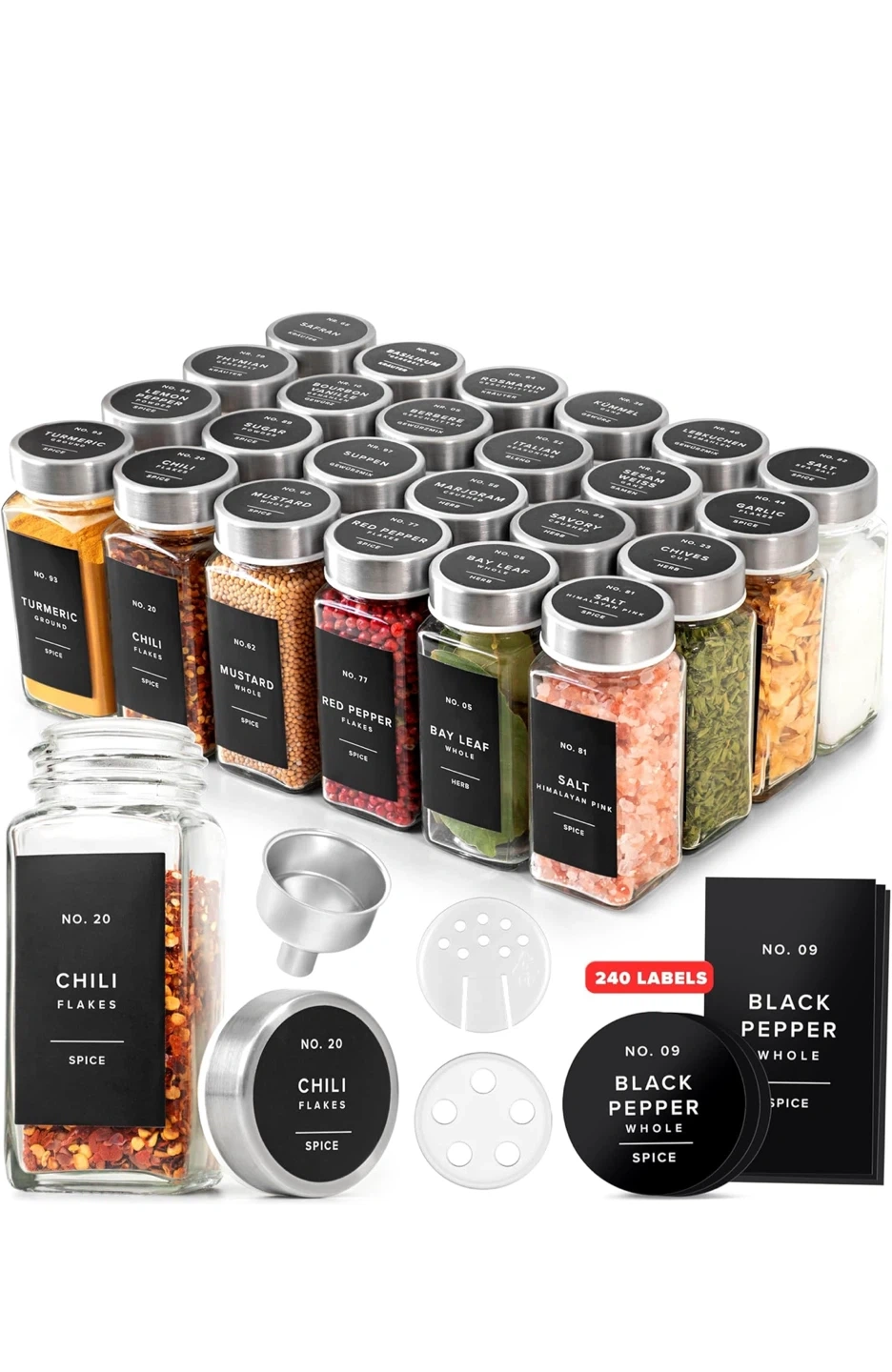 Organize your kitchen with these stylish spice jars! They come with stainless steel lids for an airtight seal. You'll get: - 24 spice jars - 30 sprinkle lids - 120 round labels - 120 square labels - 1 stainless steel funnel The labels are water and oil-repellent, so they'll stay looking great