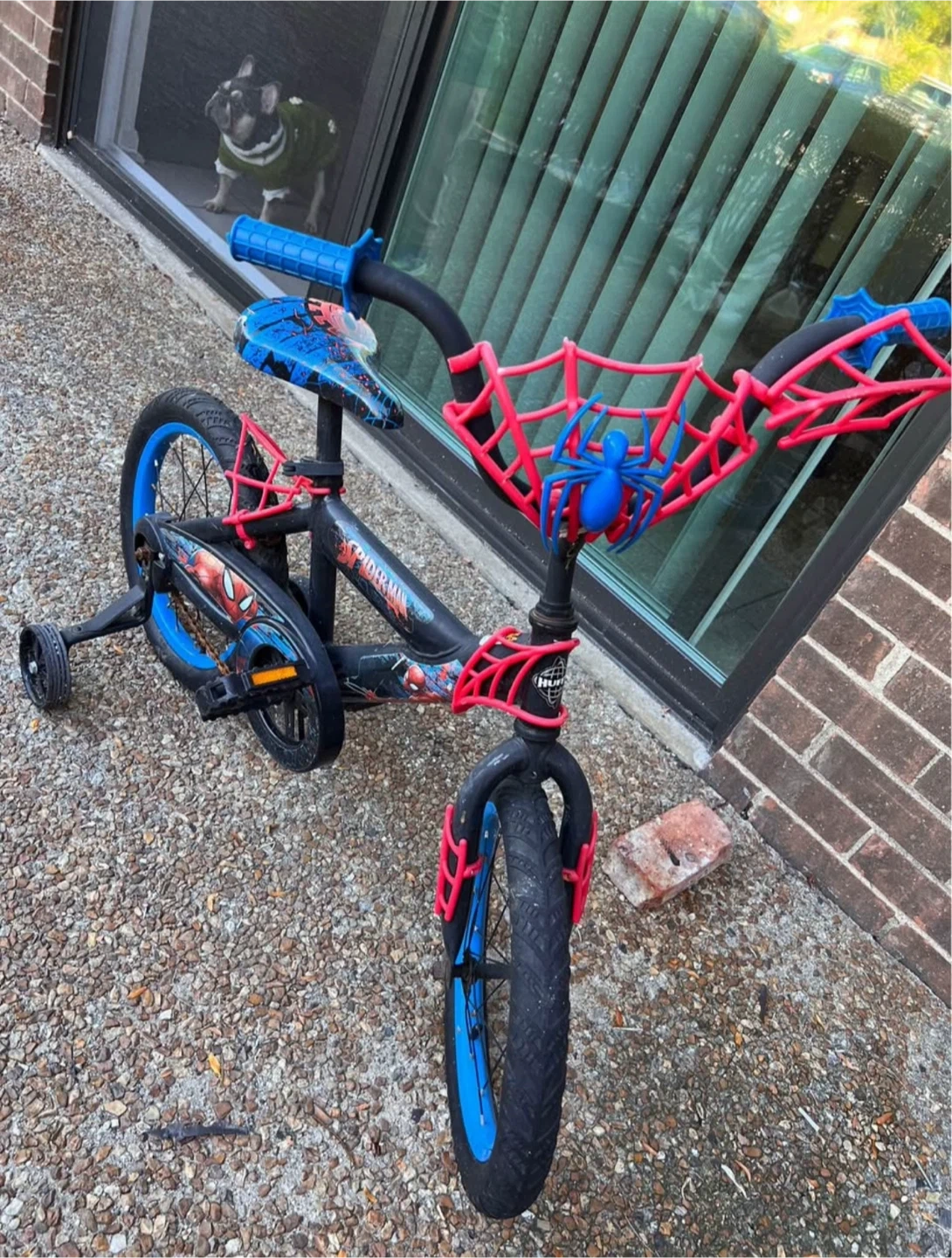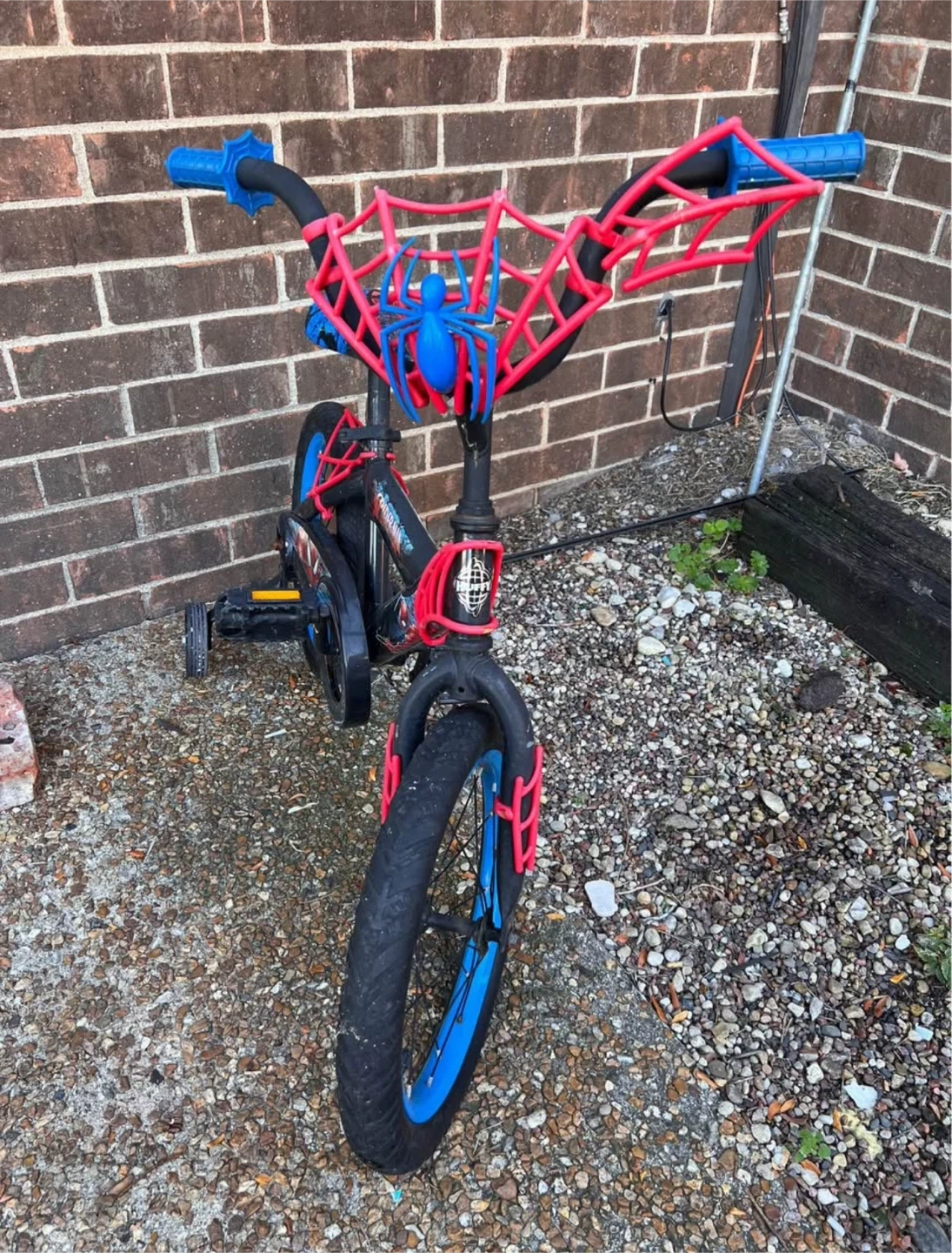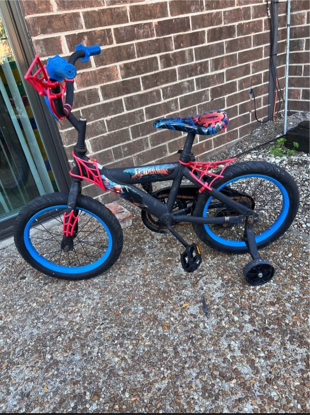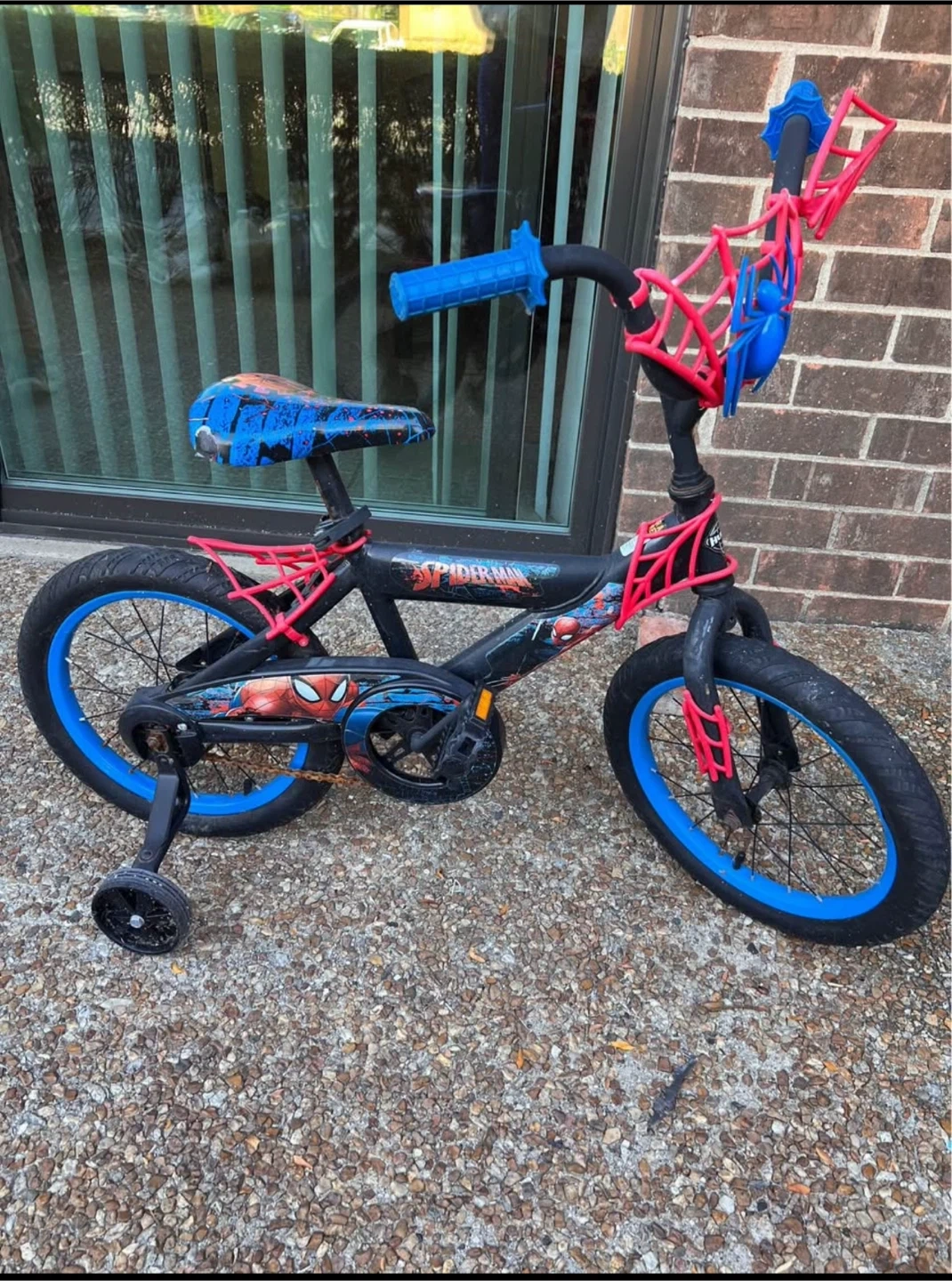 65Selling a Spiderman themed kids' bike. It's in great condition and ready for a new rider! The bike features a cool Spiderman design with blue and red accents. Perfect for young fans of the superhero