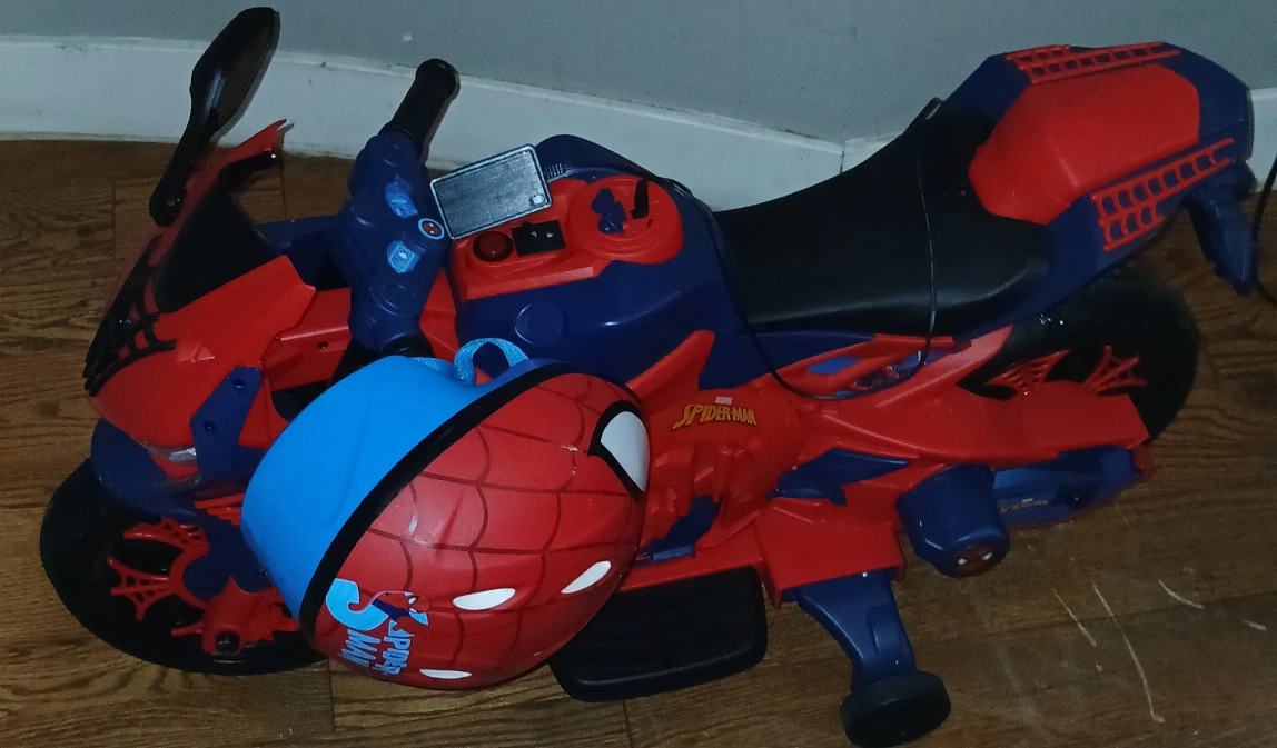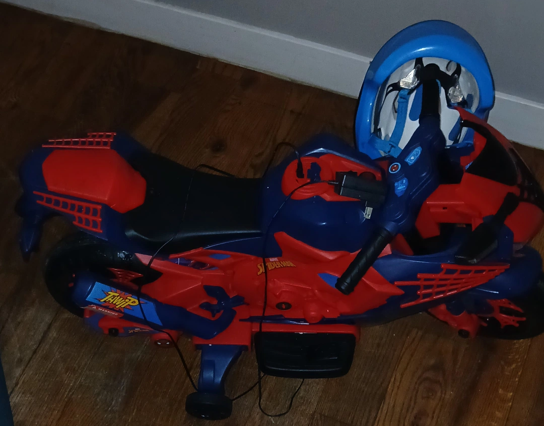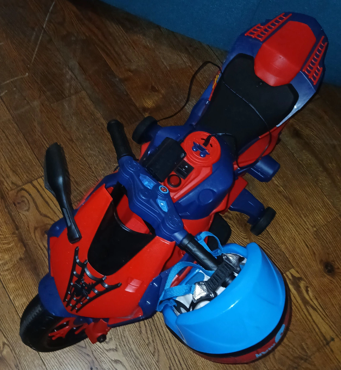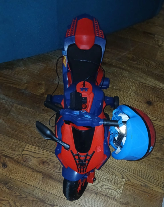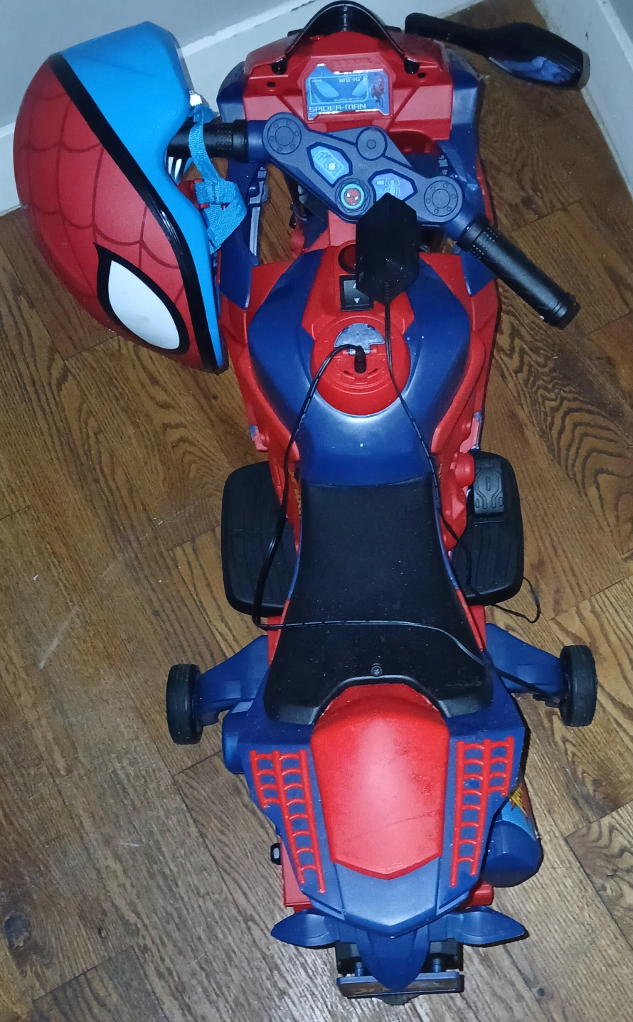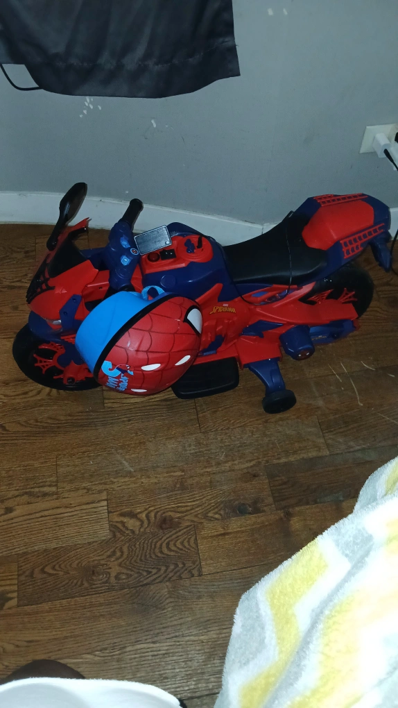 Selling a Spiderman motorcycle ride-on toy! It comes with a matching Spiderman helmet. The motorcycle is red and blue and features Spiderman designs. Perfect for any young Spiderman fan!