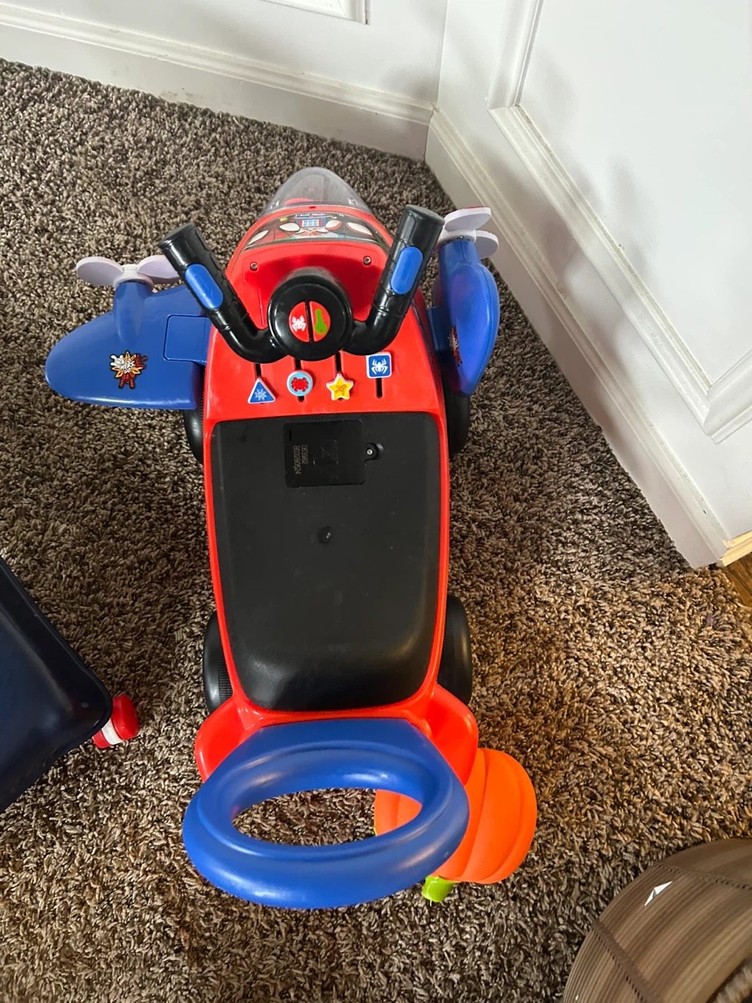 Selling a cute Spiderman-themed ride-on plane toy! It's in good condition and ready for a new little pilot. The plane is red, blue, and black, featuring Spiderman designs