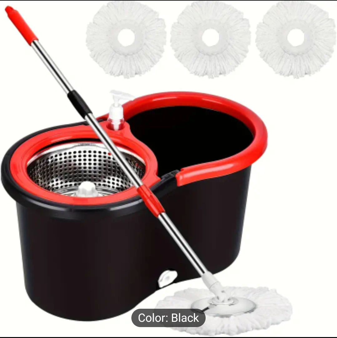 0Get your floors sparkling clean with this spin mop and bucket set! The set includes the mop, bucket, and three mop heads. The bucket features a built-in wringer for easy and efficient cleaning. Color is black and red