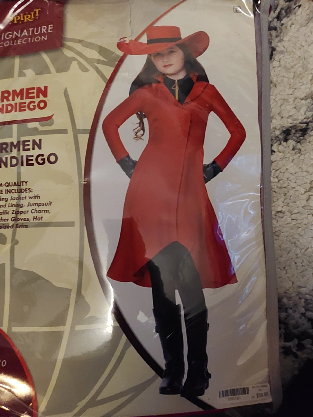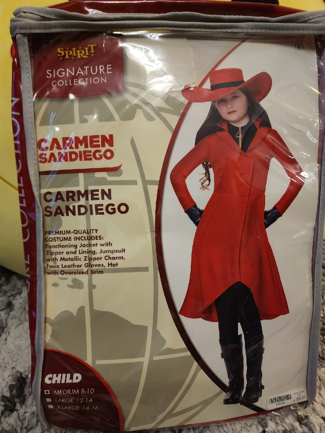Selling a child's Carmen Sandiego costume from Spirit Halloween. This is a size medium (8-10). The costume includes a jacket with zipper and lining, a jumpsuit with a metallic zipper charm, faux leather gloves, and a hat with an oversized brim. Originally bought for $59.99