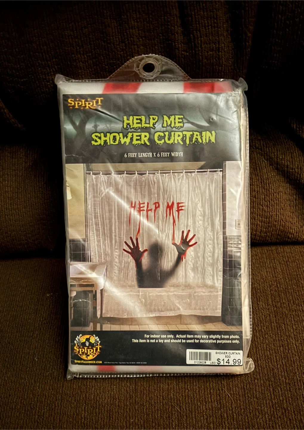 I'm selling a brand new Spirit Halloween "Help Me" shower curtain! It's still in the original packaging. It's 6 feet in length and 6 feet in width. Originally bought for $14.99