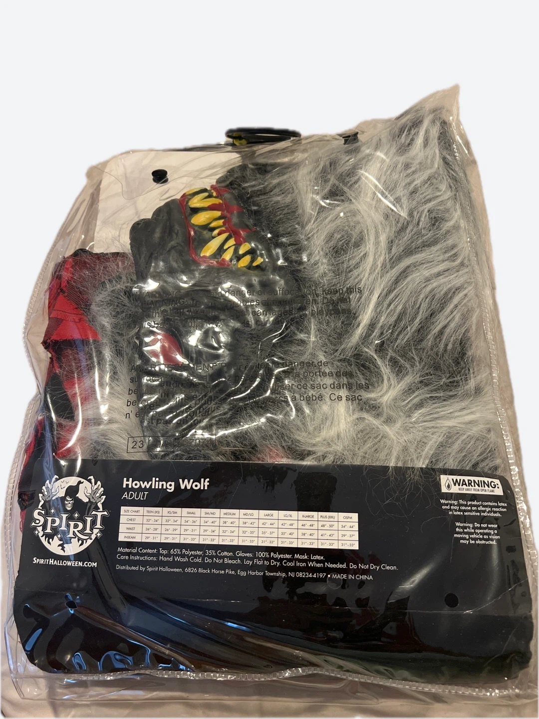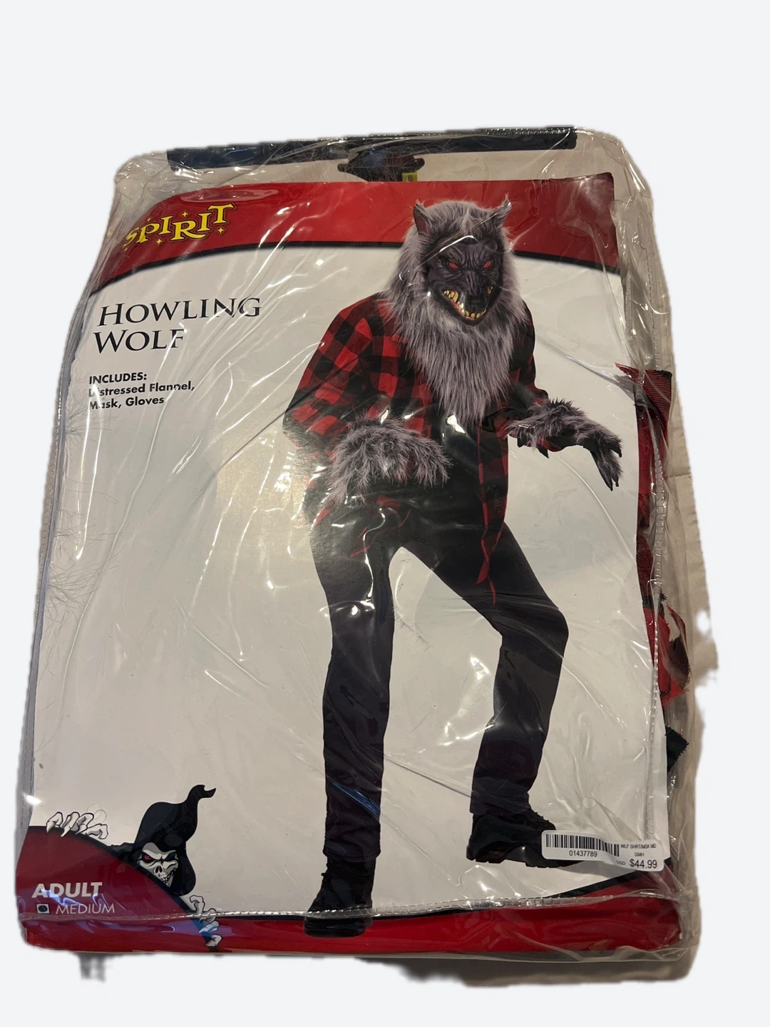 Selling a Spirit Halloween Howling Wolf adult costume, size medium! The costume includes a distressed flannel, mask, and gloves. It's still in the original packaging and ready for a new owner. Originally bought for $44.99