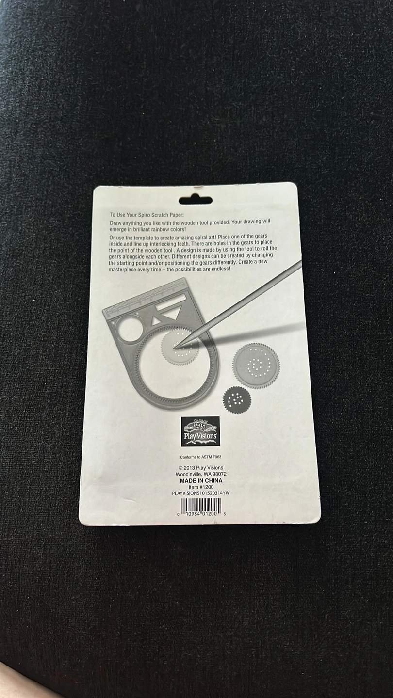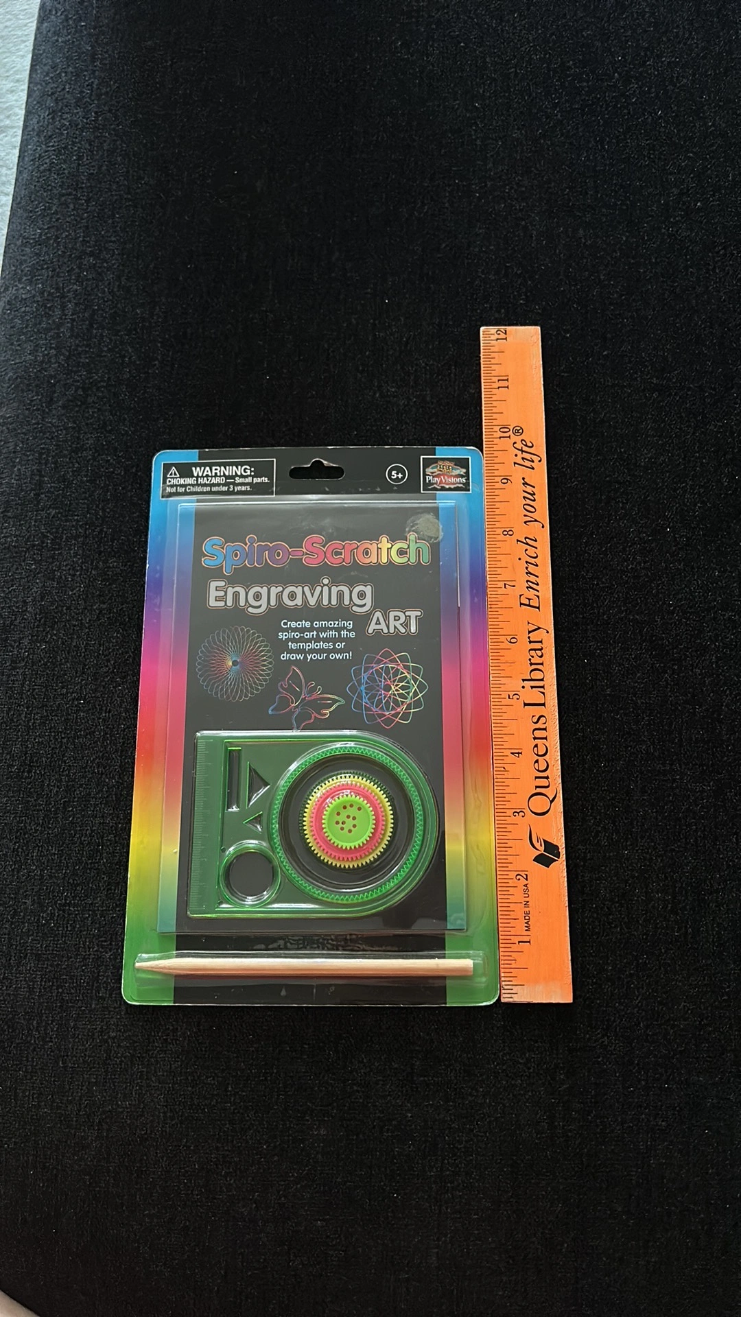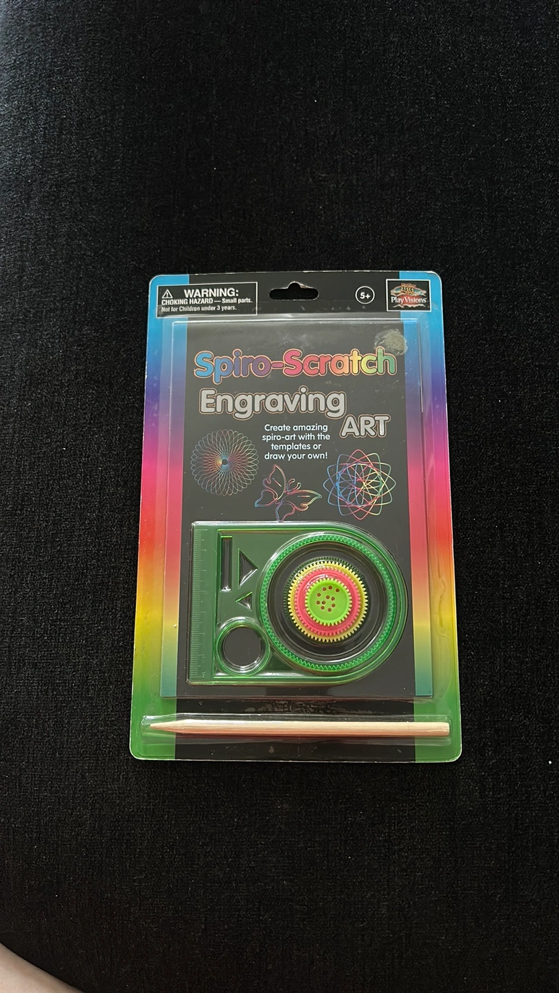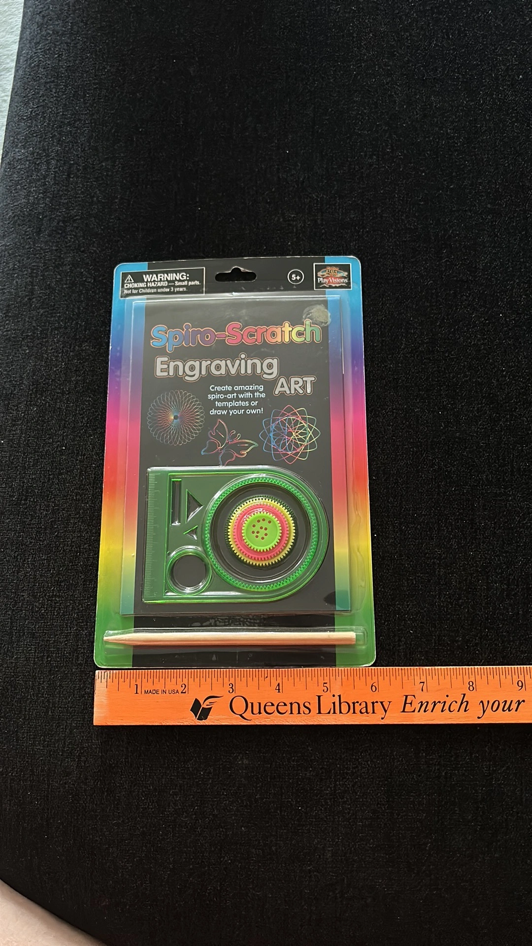 Spiro-Scratch Engraving Art Brand New Ages 5+ Create amazing spiro-art pictures using the wooden tool provided on the Spiro black pad scratch paper, or draw your own. Use the template by placing one of the gears inside and line up the interlocking teeth. Place the wooden point of the tool and roll the gears around for a beautiful, creative design on the black pad. Endless possibilities! Remember Spirograph? Well here’s a small similar version. Have hours and hours of fun! Please be able to meet in Forest Hills, Queens (occasionally in Manhattan) and take a look at my other postings too!
