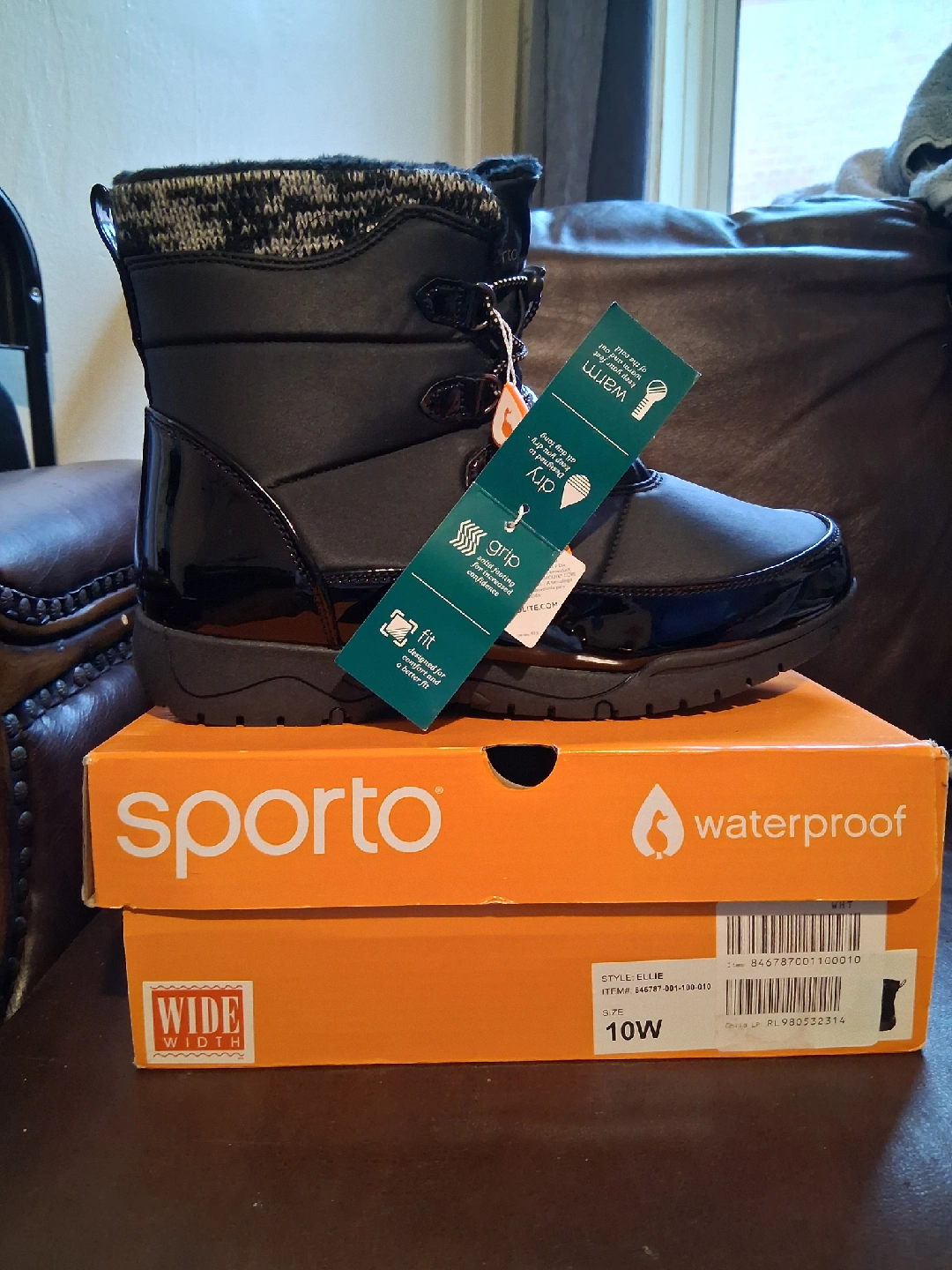 Here are a pair of Sporto Ellie winter boots in a women's size 10 wide! These boots are waterproof, so they're great for keeping your feet dry. They're also designed for comfort and a better fit, and the grip provides increased confidence. The box is included!