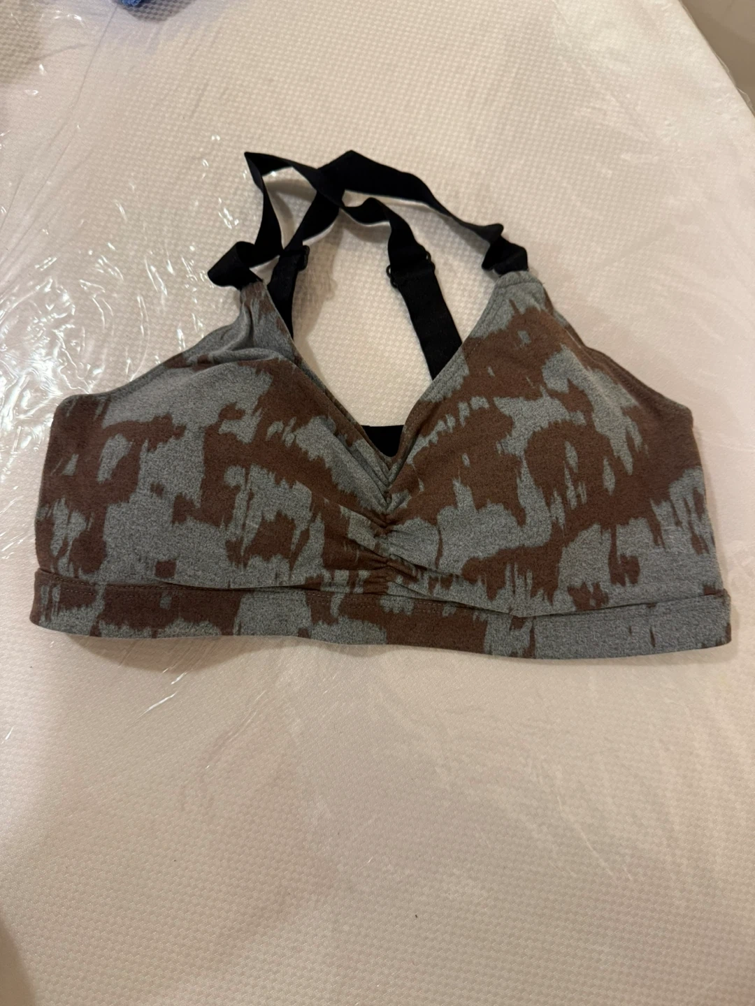 10Selling a sports bra in a gray and brown pattern! It has black straps and looks to be in good condition