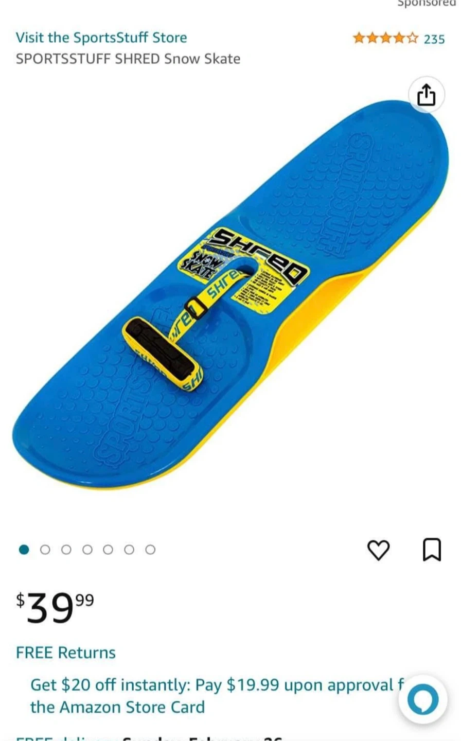 73Selling a SportsStuff Shred Snow Skate. It's blue and yellow and ready for some winter fun! Originally retailed for $39.99
