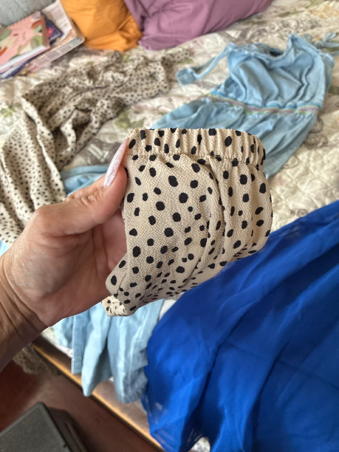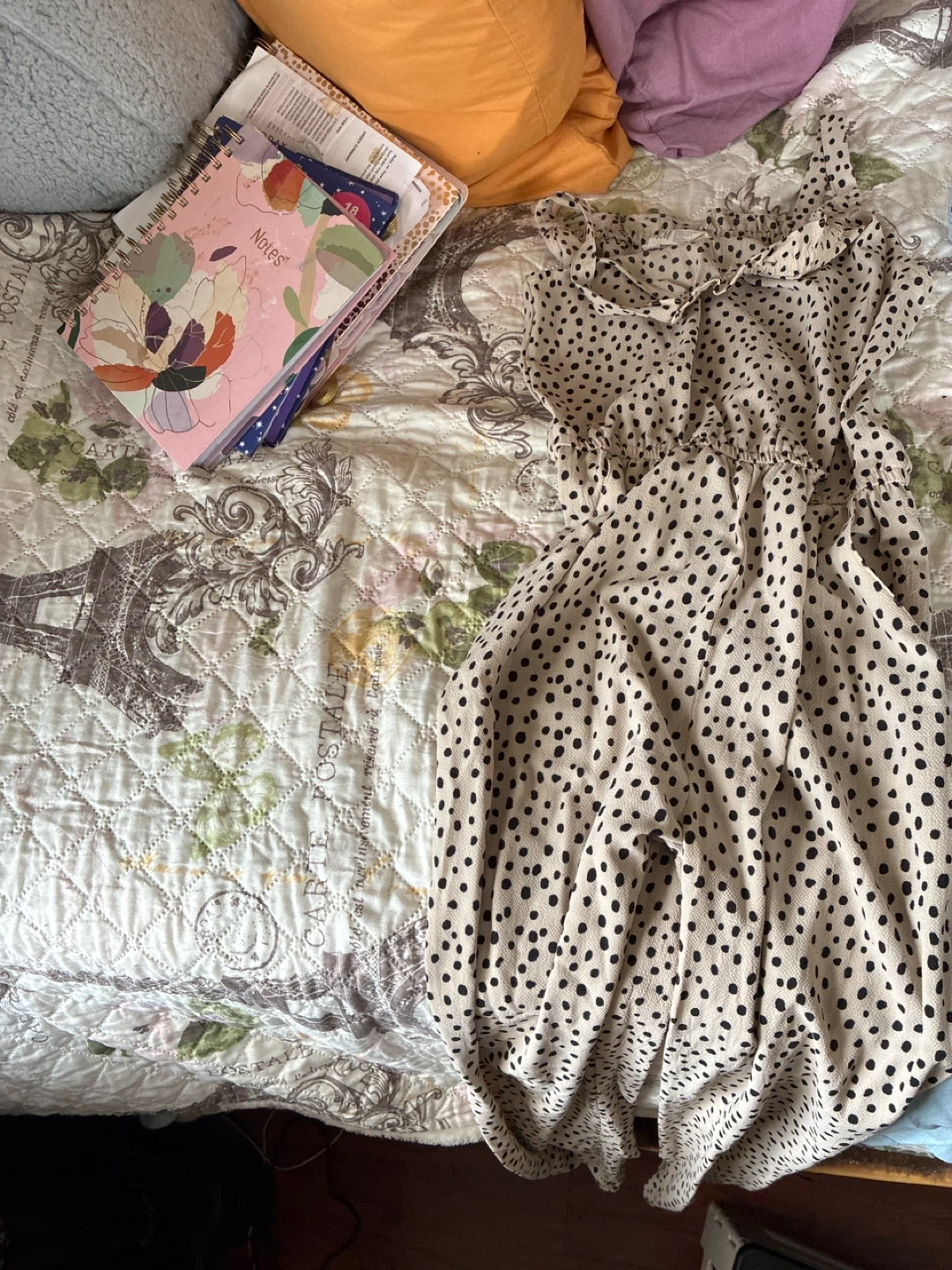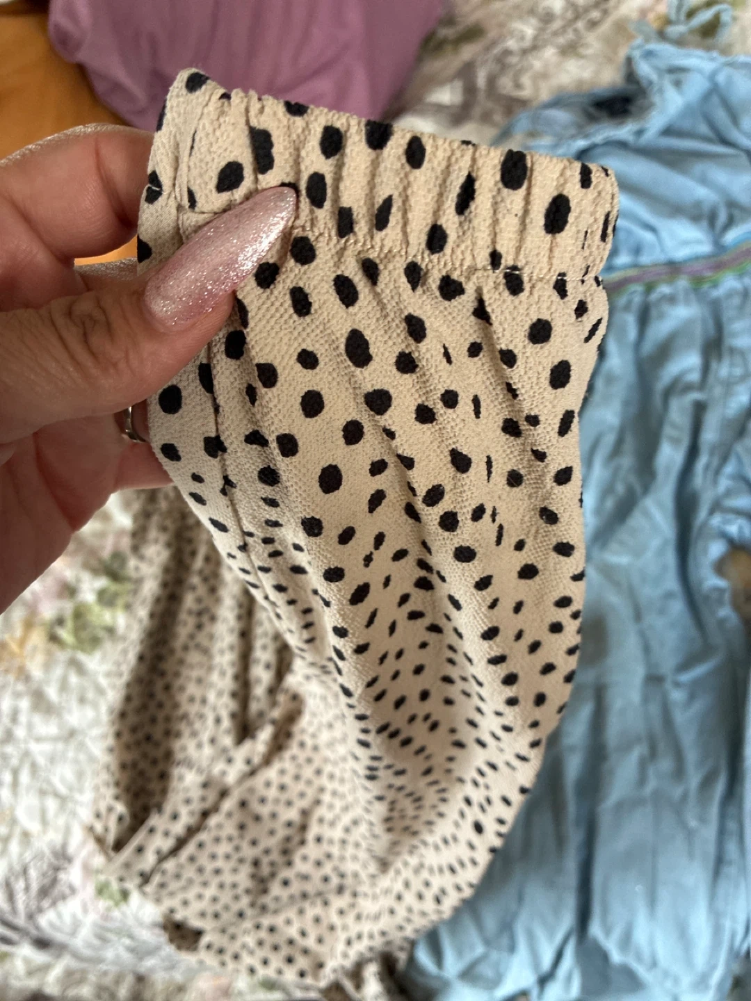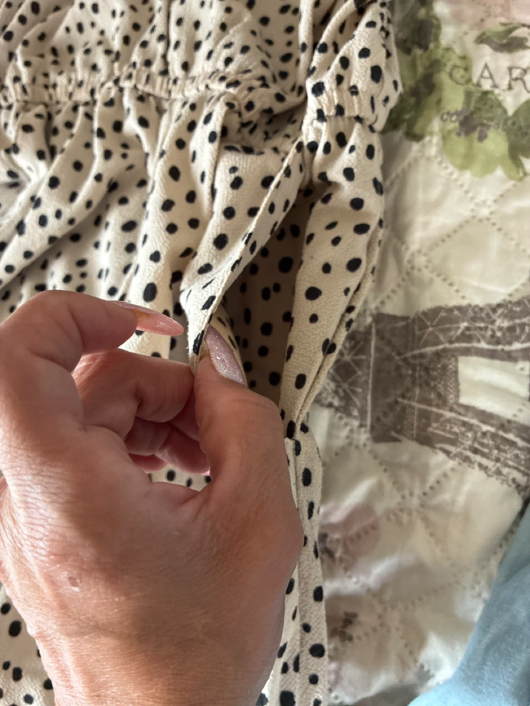 Selling a cute dress with a beige background and black polka dots! It's in great condition and has a comfortable, flowy fit. Perfect for a casual day out or a fun summer event! It has a comfortable elastic waist.