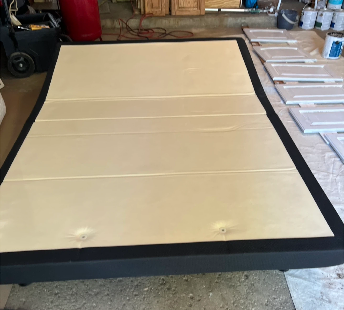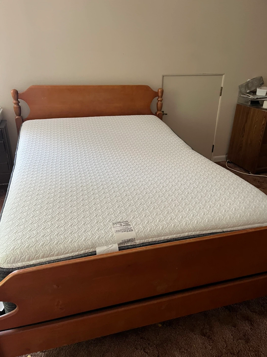 Springwall mattress in good condition. It has a white patterned top and a black base. Perfect for a guest room or anyone needing a comfortable mattress Mattress firm,beauty rest hybrid plush and ease 3.0 adjustable base.