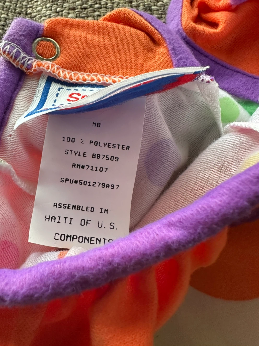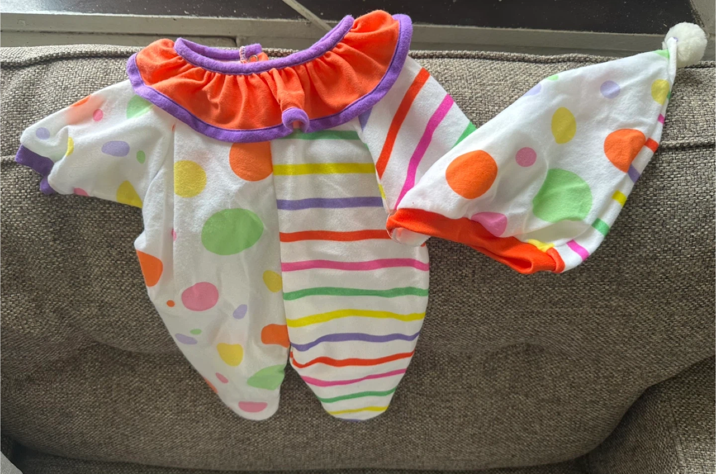 704Here's a cute baby clown costume from Sprout in size NB! The costume is made of 100% polyester and features a colorful design with polka dots and stripes. It's perfect for Halloween or dress-up play! Pick up East 106th st and 1st ave