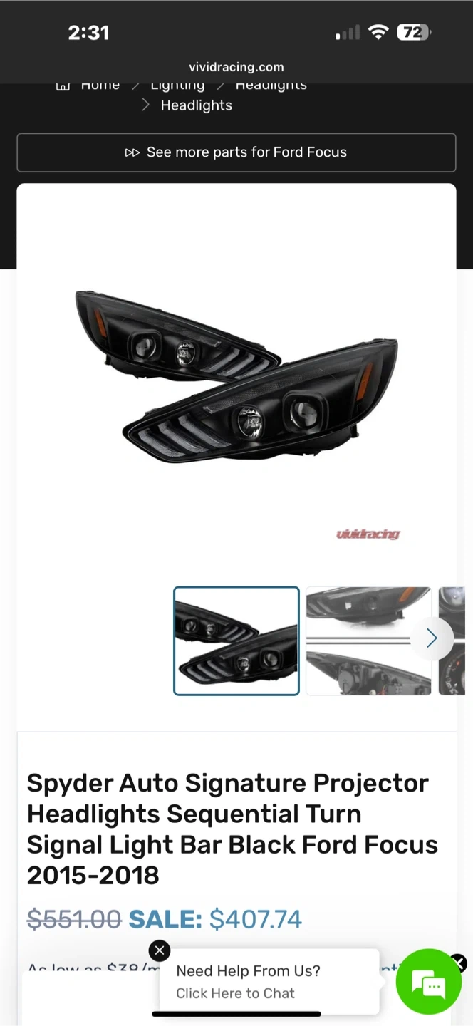 Selling a pair of Spyder Auto Signature Projector Headlights with Sequential Turn Signal Light Bar in Black for Ford Focus models from 2015-2018. These were originally listed for $551.00 but were on sale for $407.74. Give your Ford Focus a sleek, updated look with these stylish headlights!