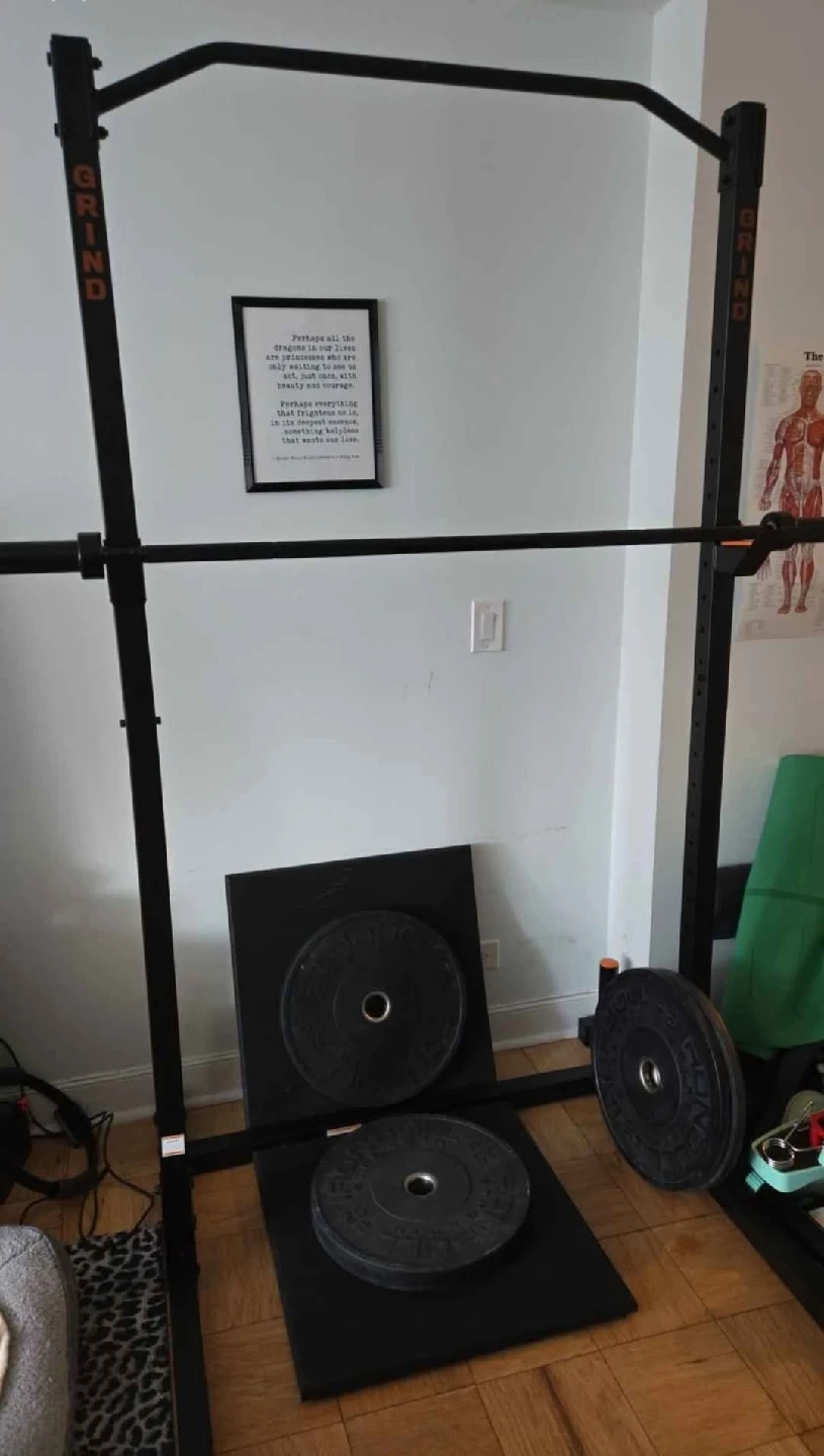 65Selling full squat rack set that includes squat rack, two 10lb and two 25lb plates, heavy duty mats, three sets of clips along with a barbell. Great for building strength at home!