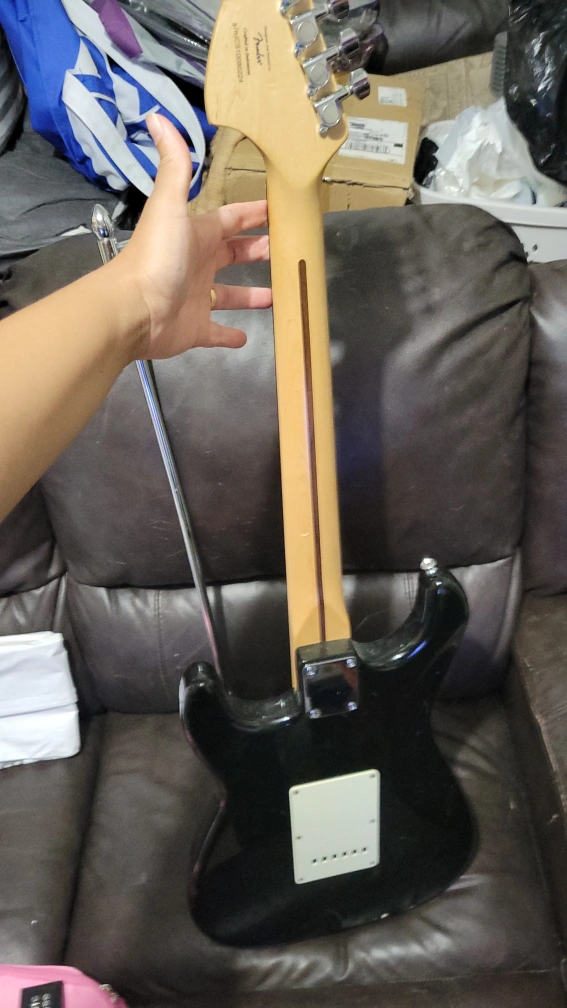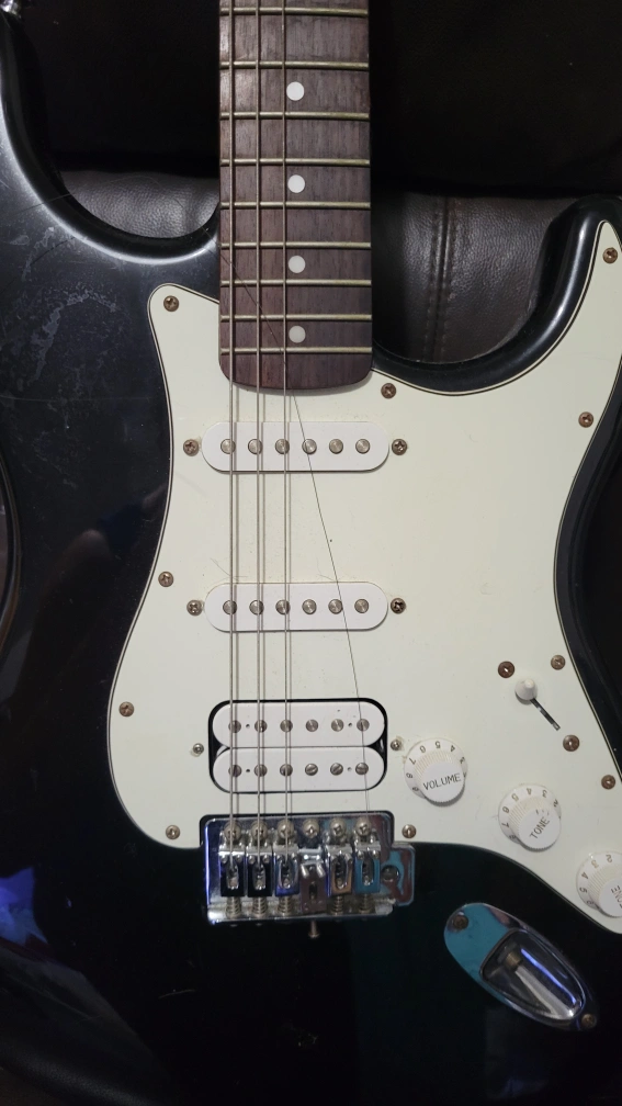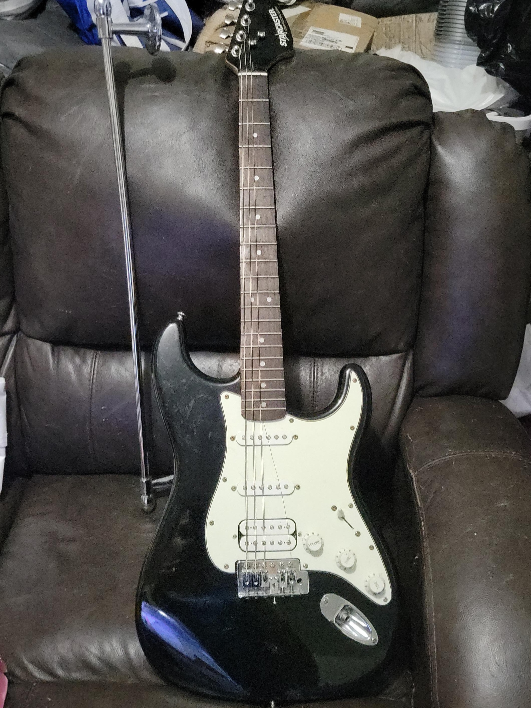 Selling a Squier Stratocaster electric guitar in black. It's in good condition and ready to play! Perfect for beginners or experienced players looking for a reliable instrument