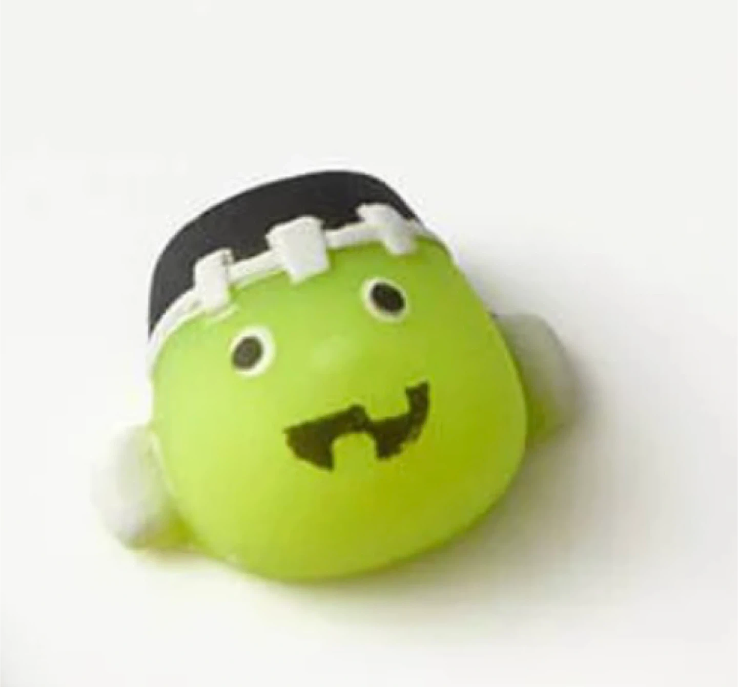 This is a mini squishable Frankenstein toy. It's green with black hair and a cute smile. Perfect for Halloween or just for fun! Halloween