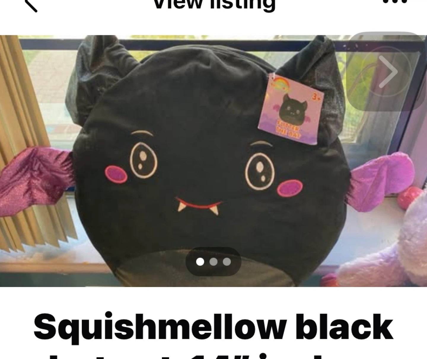 Selling a Squishmallow Flitter the Bat plush toy! This cute bat is 14 inches tall and is in great condition. The tag indicates it's suitable for ages 3+