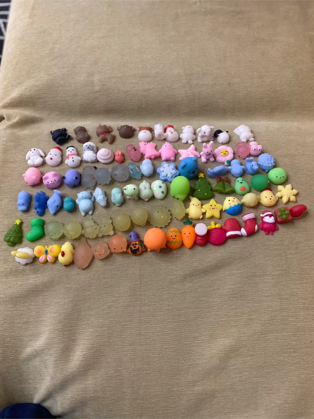 Selling a collection of assorted squishy toys! There are many different shapes and colors, including animals and holiday-themed squishies. Perfect for stress relief or just for fun. Total is 88, pick up and cash only