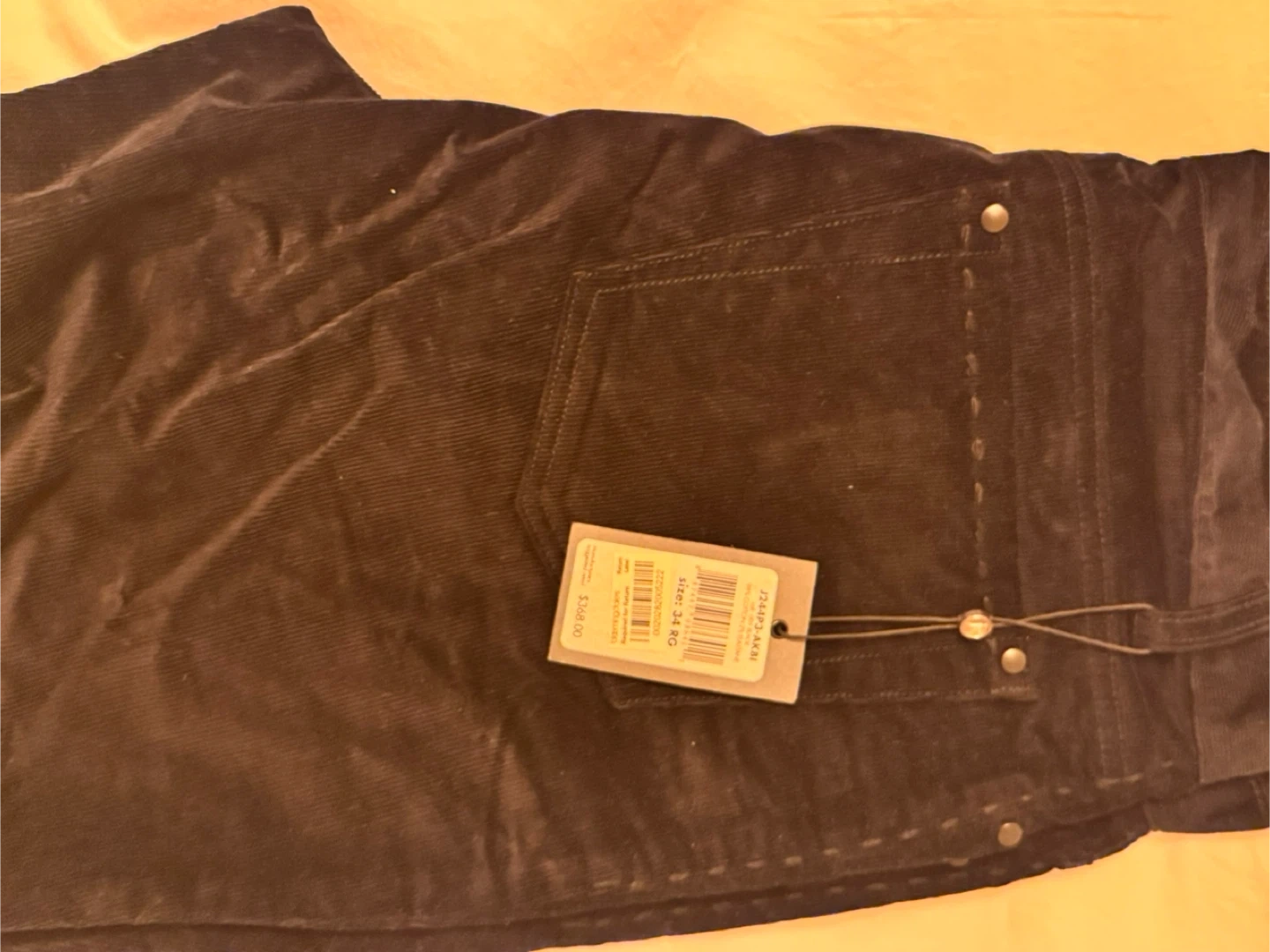 Here are some John Varvatos corduroy pants in size 34. They are a dark brown color and have a tag that shows they were originally $138.00