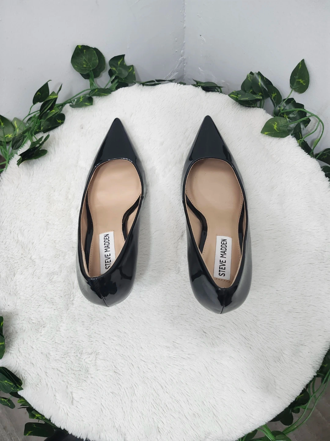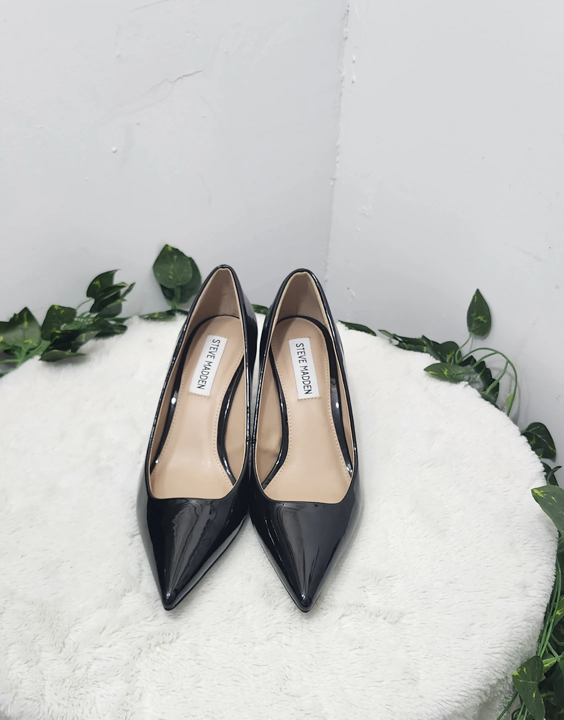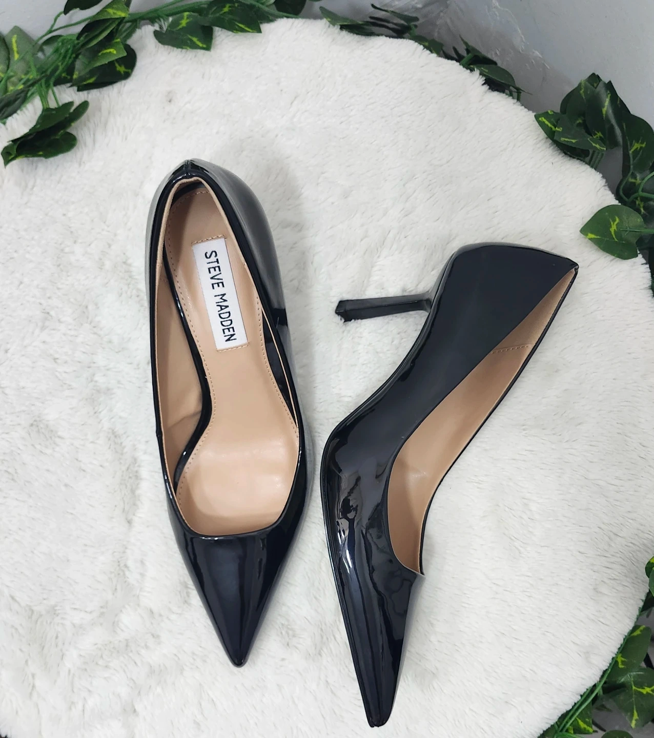 Zapatos de tacón Steve Madden en charol negro. Estos tacones de punta afilada presentan una silueta clásica. El tacón de aguja aporta un acabado elegante. ¡Perfectos para realzar cualquier atuendo!