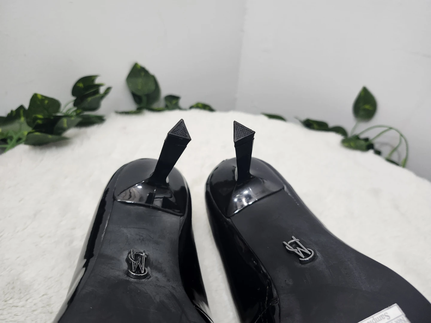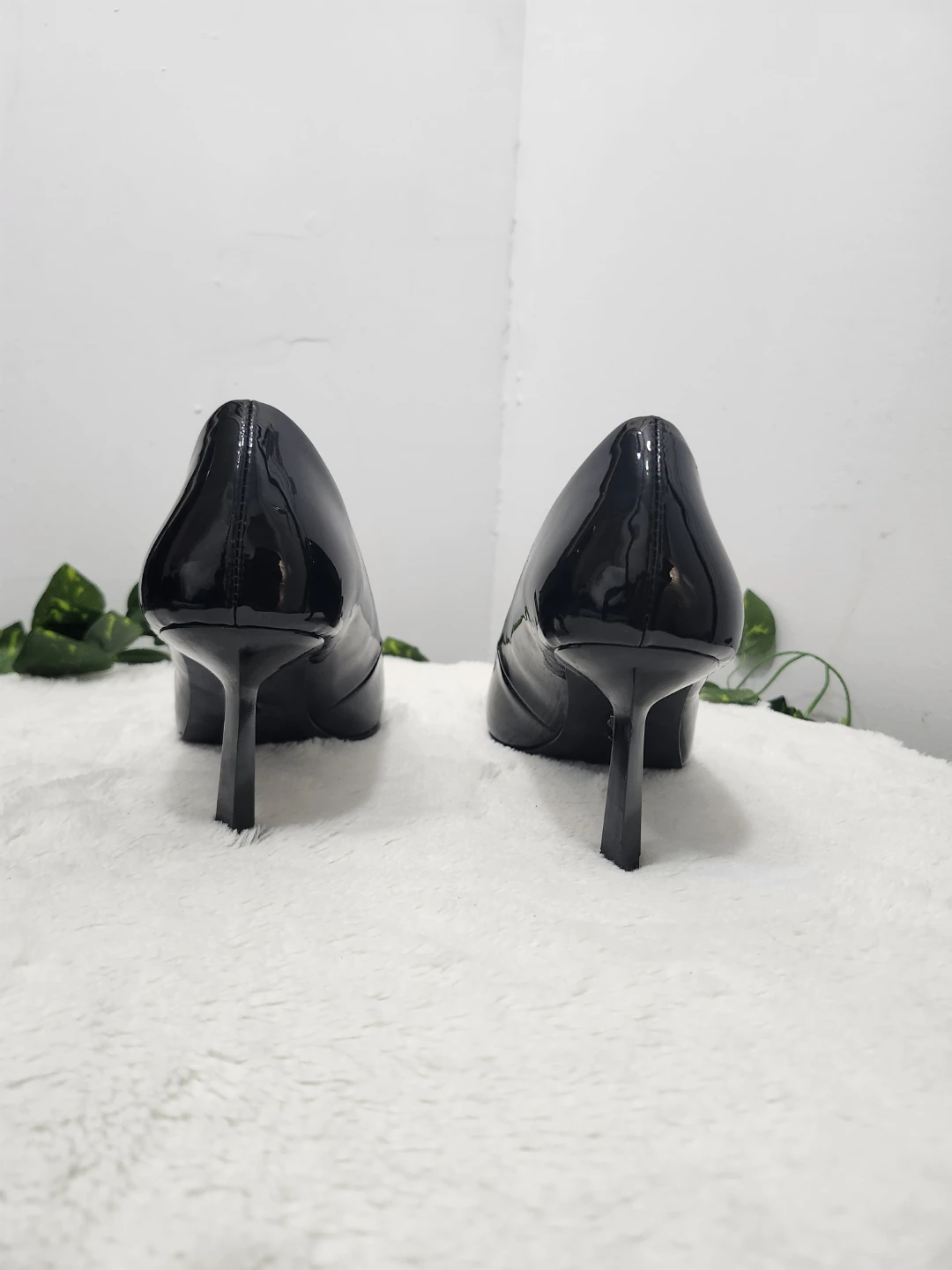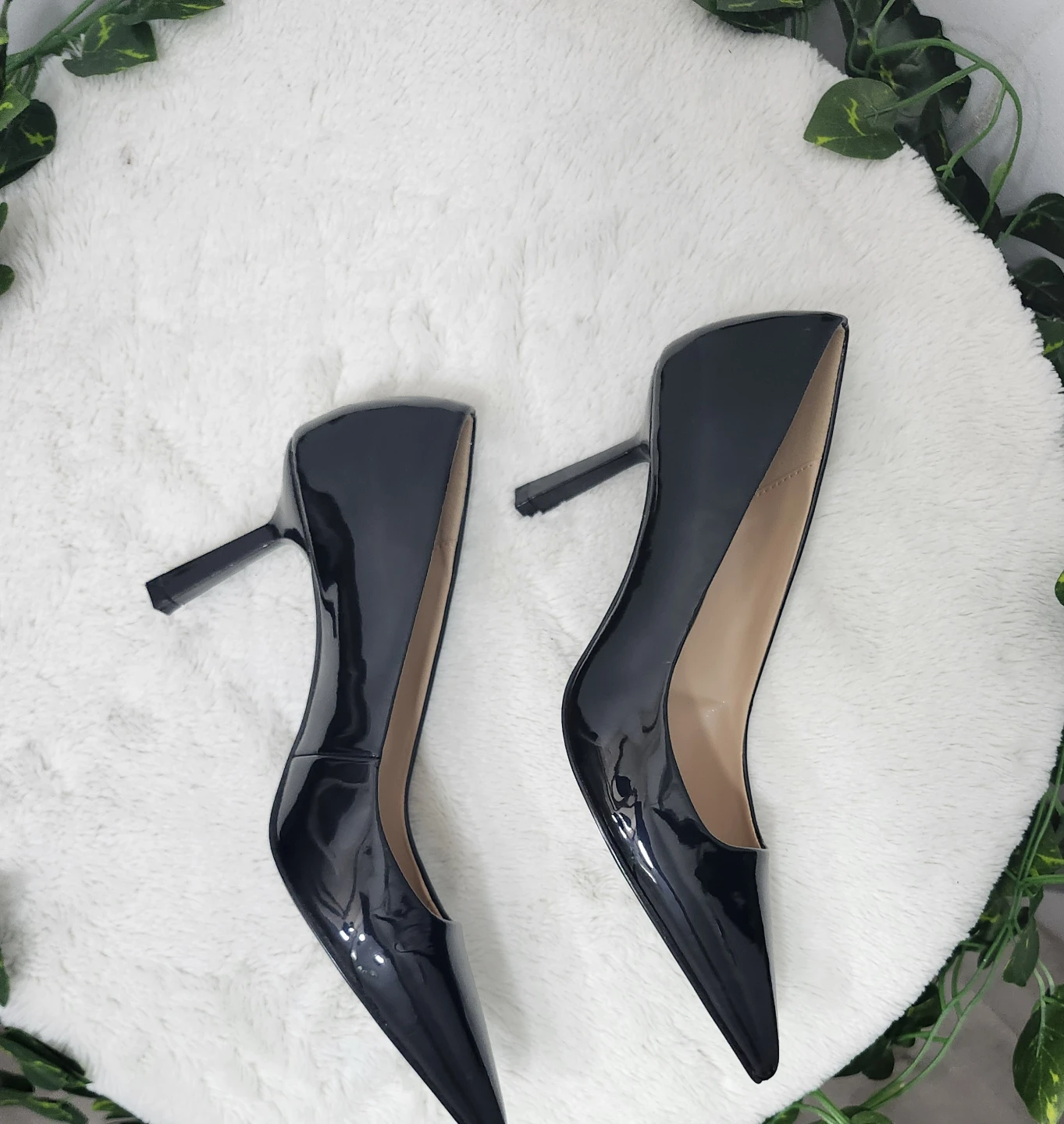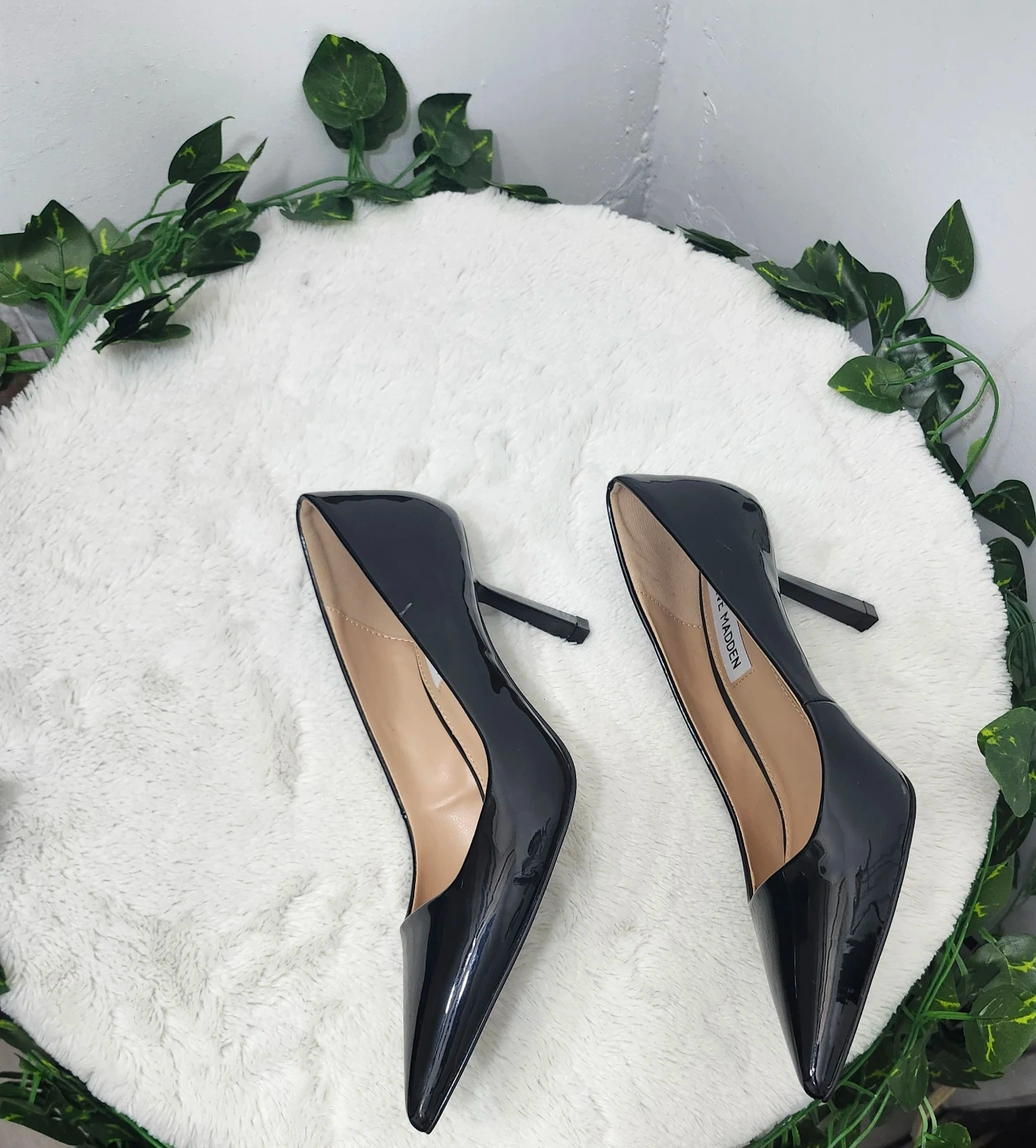 Zapatos de tacón Steve Madden en charol negro. Estos tacones de punta afilada presentan una silueta clásica. El tacón de aguja aporta un acabado elegante. ¡Perfectos para realzar cualquier atuendo!