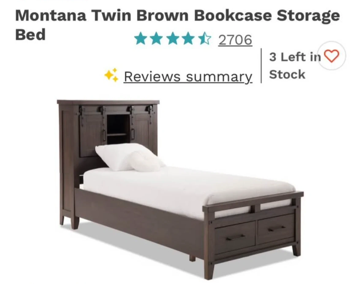 Montana Twin Bookcase Storage Bed. Twin size. Brown color. Includes bookcase headboard with storage and two drawers at the foot of the bed. Rustic wood finish. Comes with Matress .