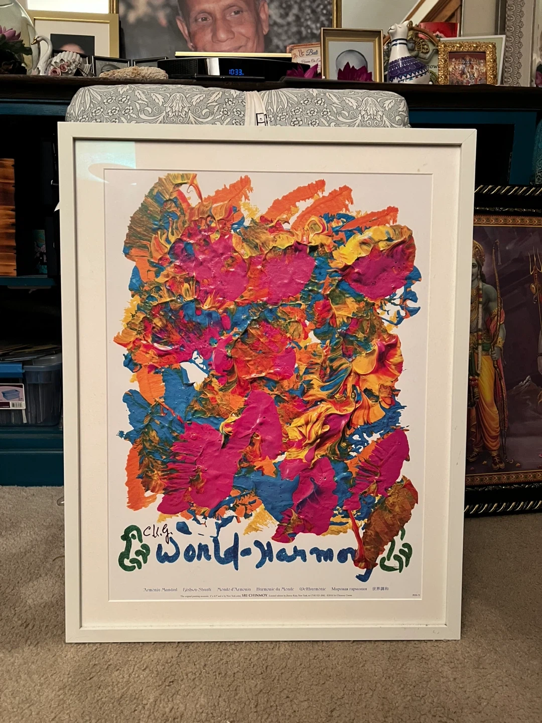 60Framed art print with an abstract design in bright colors. The print features the words 'World-Harmony' and is attributed to Sri Chinmoy. The frame is white. Perfect for adding a pop of color and a message of peace to your space