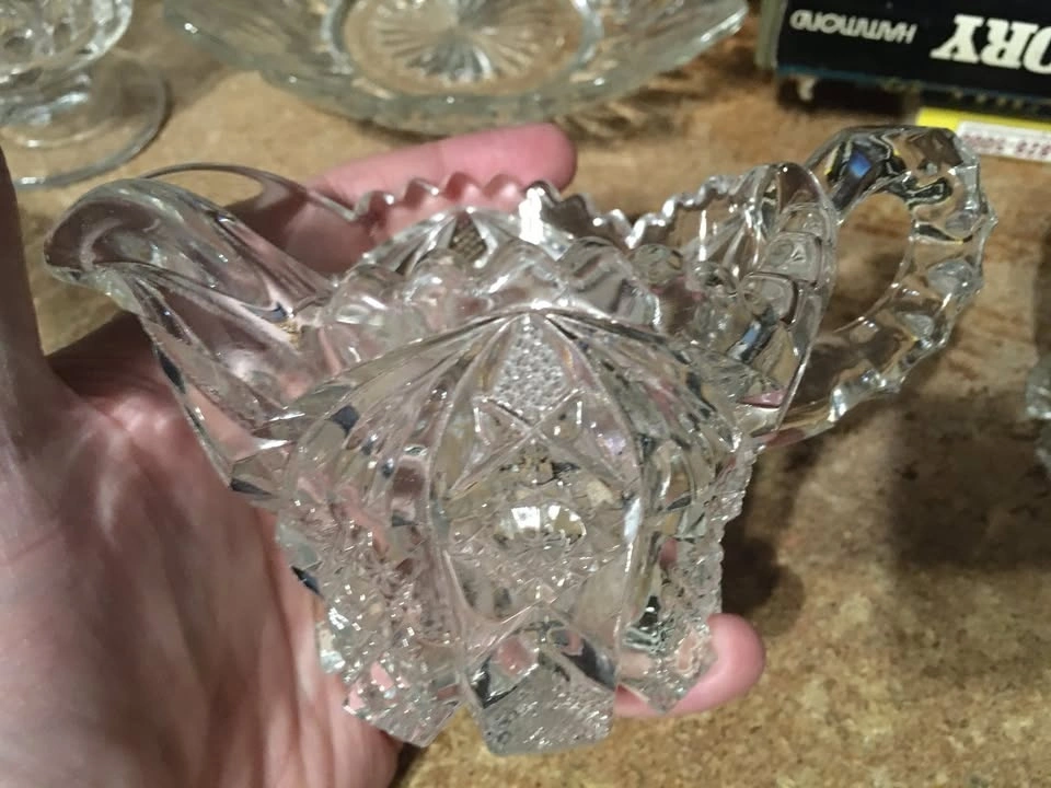 IMPERIAL GLASS NUCUT CLEAR OPEN SUGAR BOWL AND CREAMER. BOTH IN GOOD CONDITION ABOUT 4-4.5" ACROSS 3" TALL