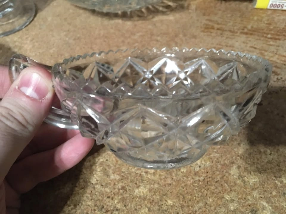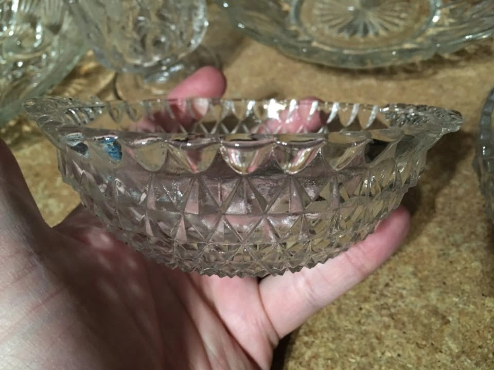 VINTAGE CLEAR HOBNAIL GLASS BOWL HANDLED SCALLOPED EDGE DIAMOND 5". GOOD CONDITION 5" ACROSS 1 7/8" TALL
