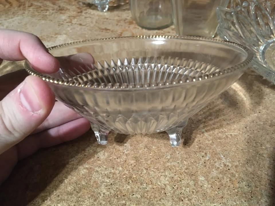 VINTAGE CRYSTAL GLASS FOOTED BOWL WITH GOLD BEADED 6". GOOD CONDITION 6" ACROSS 2 1/2" TALL