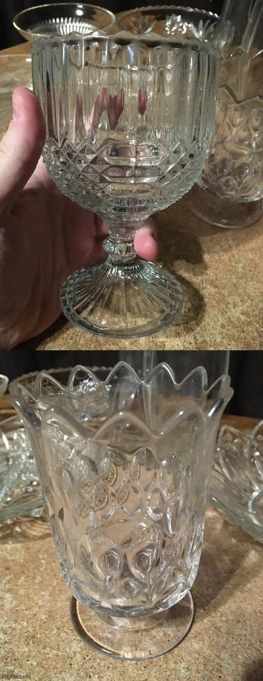 VINTAGE CLEAR GLASS GOBLET VASE POINTED CROWN TOP 5 1/4" TALL 3 1/4" ACROSS. GOOD CONDITION. 12 POINTED TOP CROWN LIKE, 24 OVAL LIKE SHAPES AROUND IT
