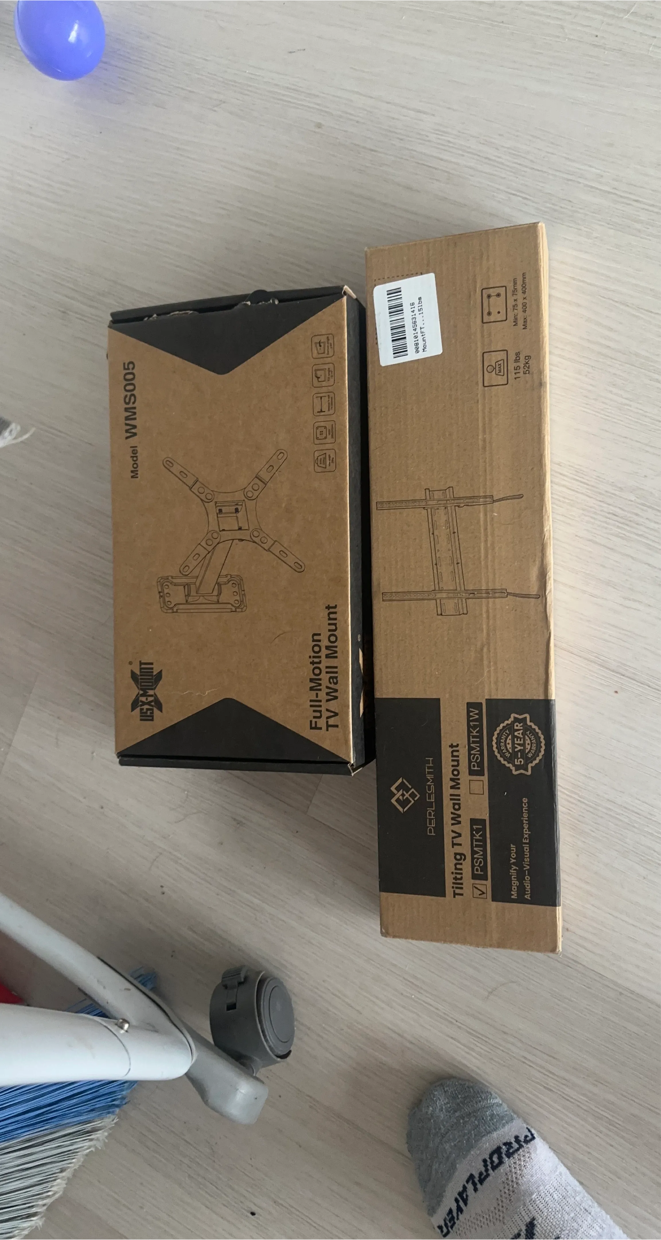 Two TV wall mounts included. One is a full-motion mount by USX Mount, model WMS005. The other is a tilting TV wall mount by Perlesmith, model PSMTK1. The Perlesmith mount supports up to 115 lbs (52kg) and VESA patterns from 75x75mm to 400x400mm. It also has a 5-year warranty.