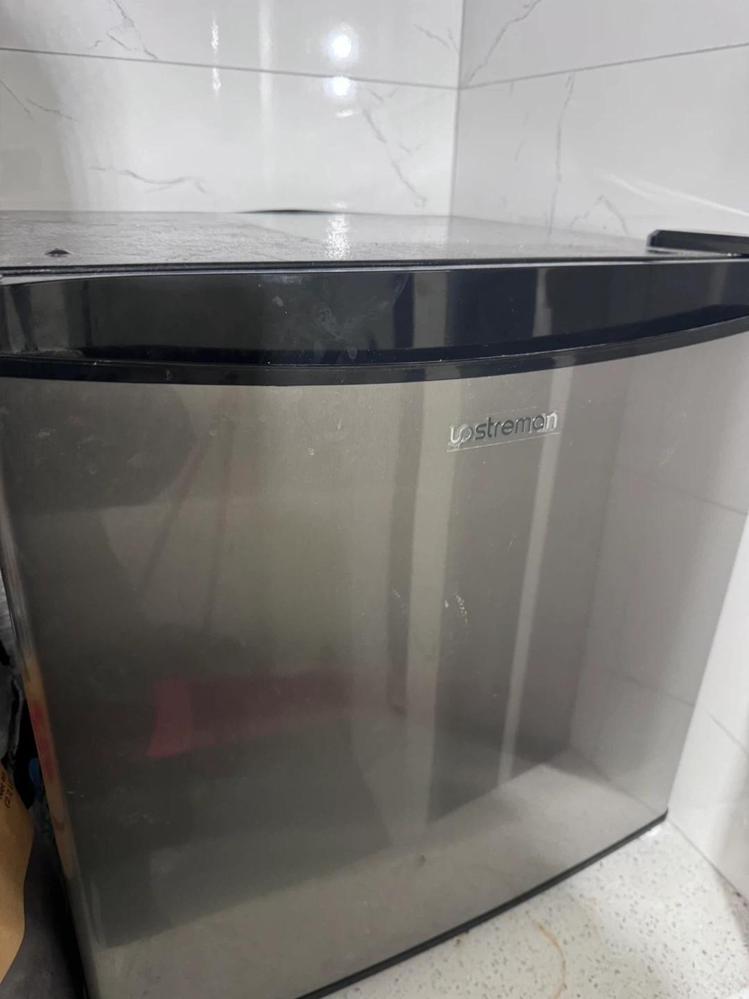 This is an Osterman mini refrigerator. It's a compact appliance perfect for small spaces. It includes a freezer compartment and adjustable temperature settings.