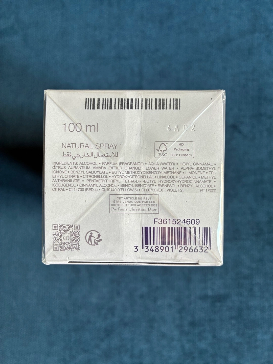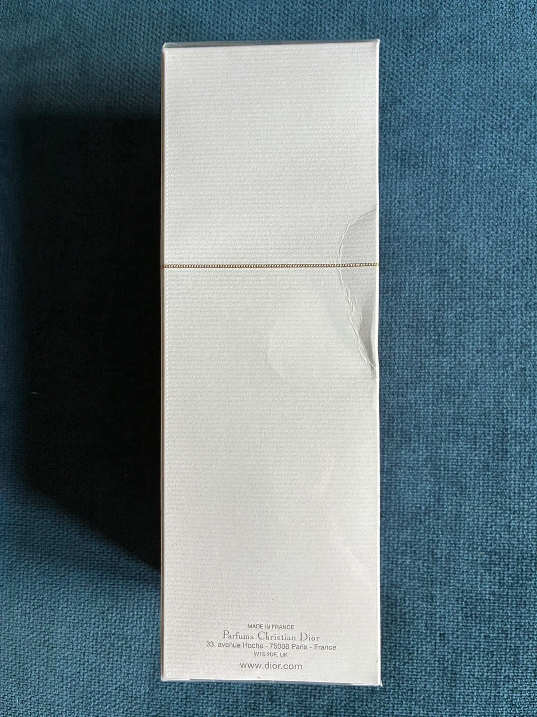 An unopened perfume box. Made in France. White packaging with gold lettering.