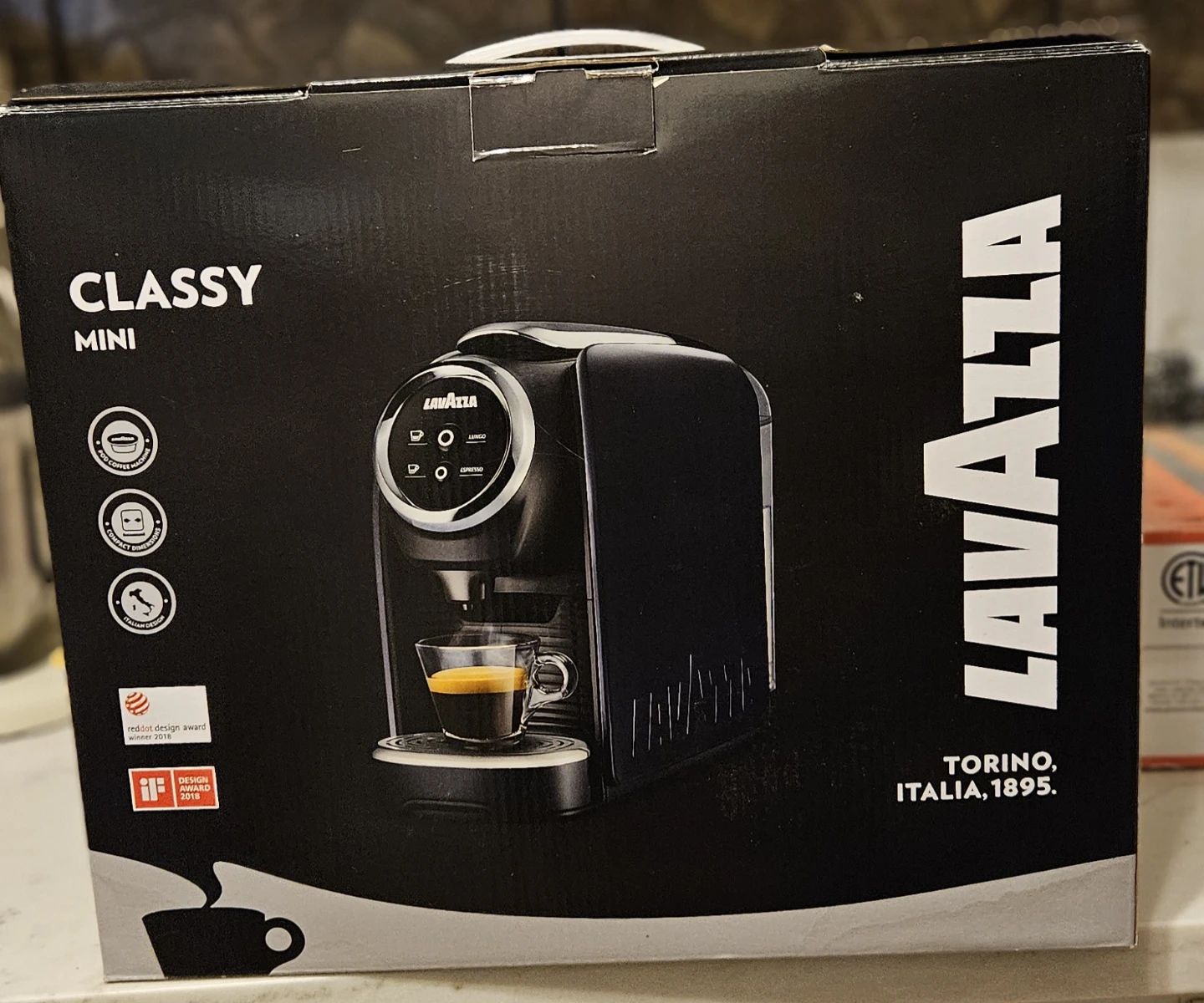 This is the Lavazza Classy Mini espresso machine. It's designed for coffee machines and has compact dimensions. Features Italian design and won a reddot design award in 2018.