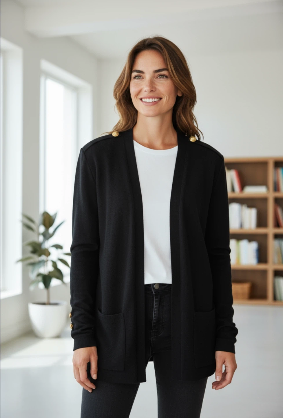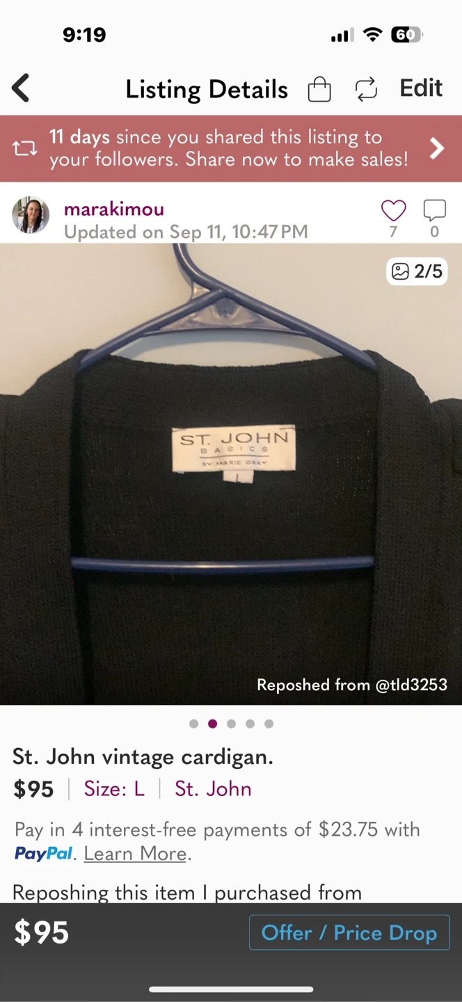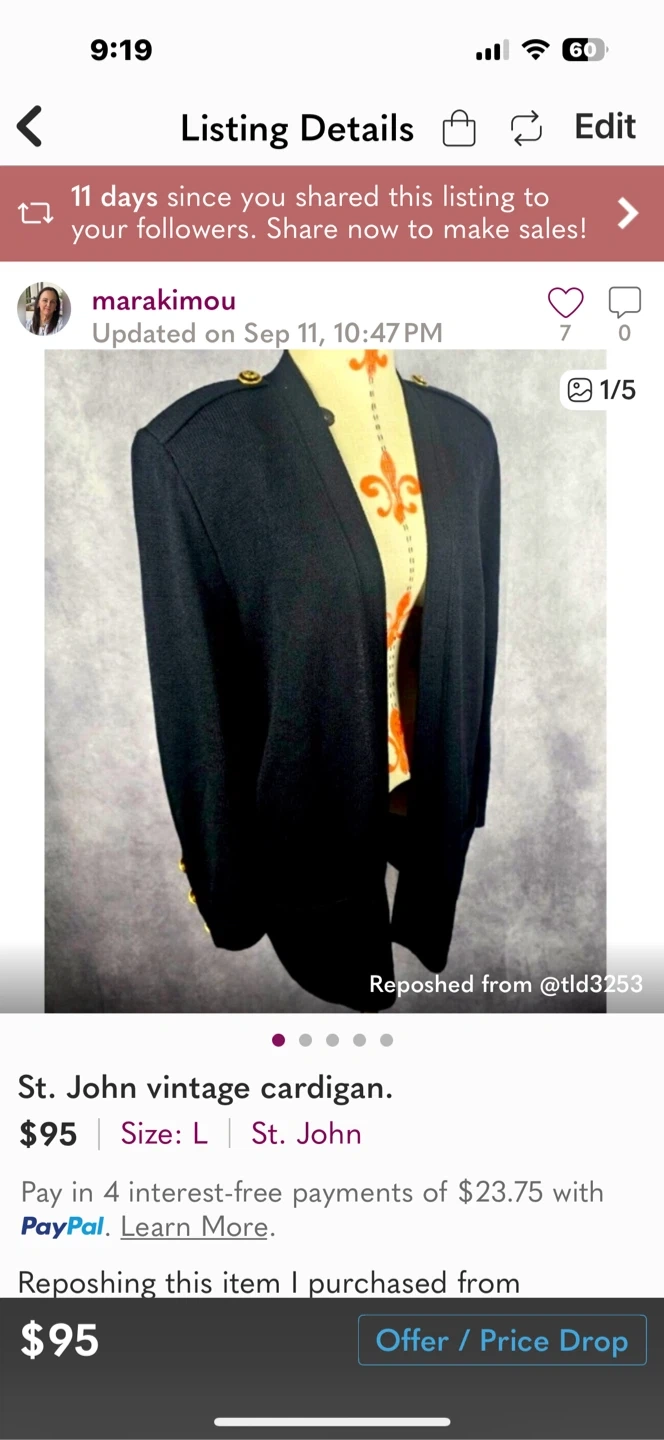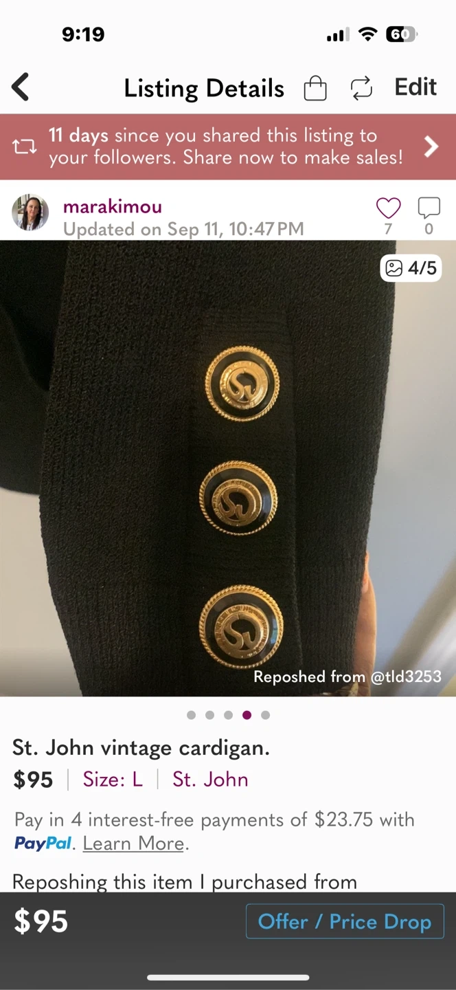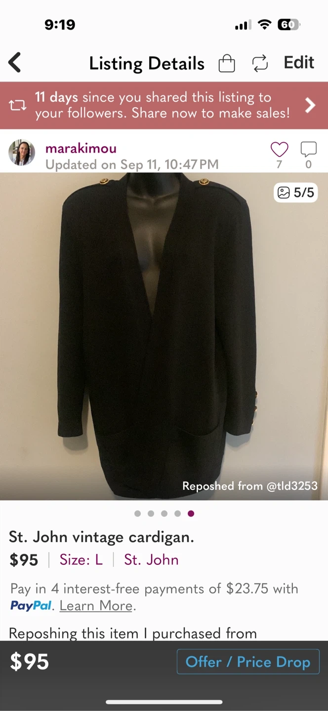 Selling a St. John vintage cardigan in black. It's a size L and has a classic, elegant look. The cardigan features gold-tone buttons on the sleeves and shoulders, adding a touch of sophistication. Perfect for layering or wearing on its own!