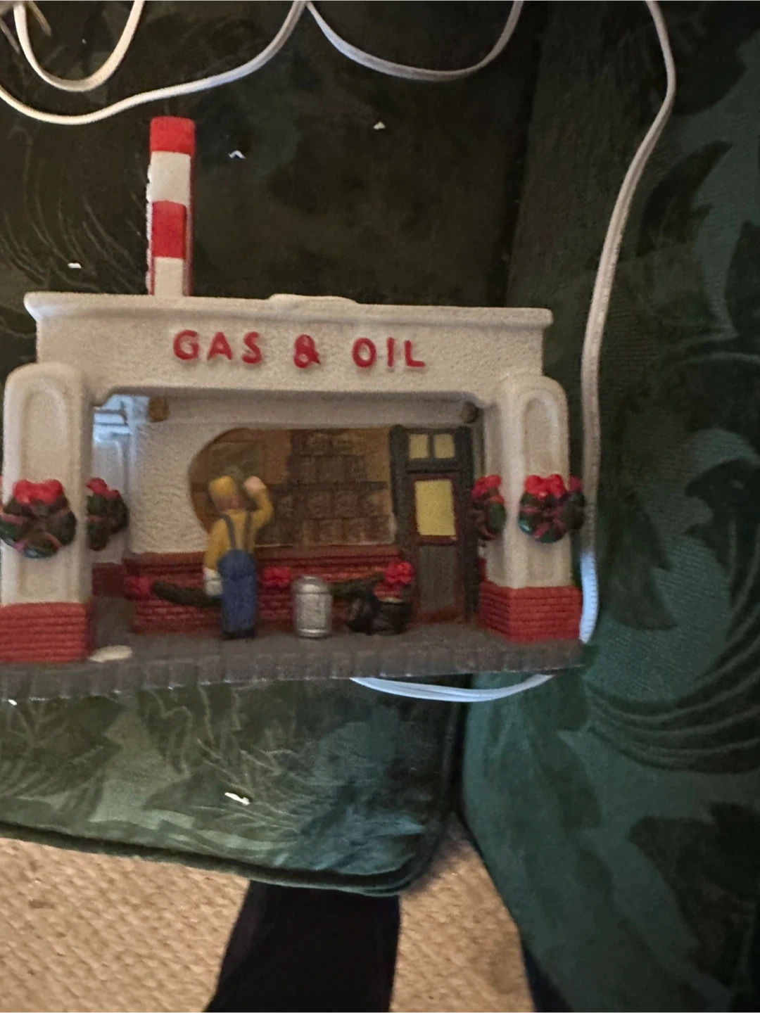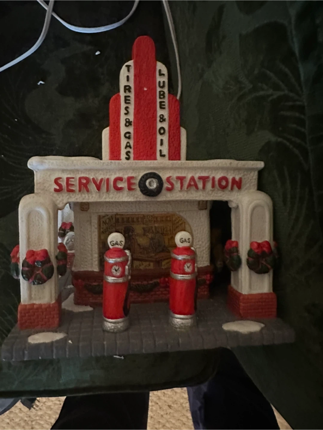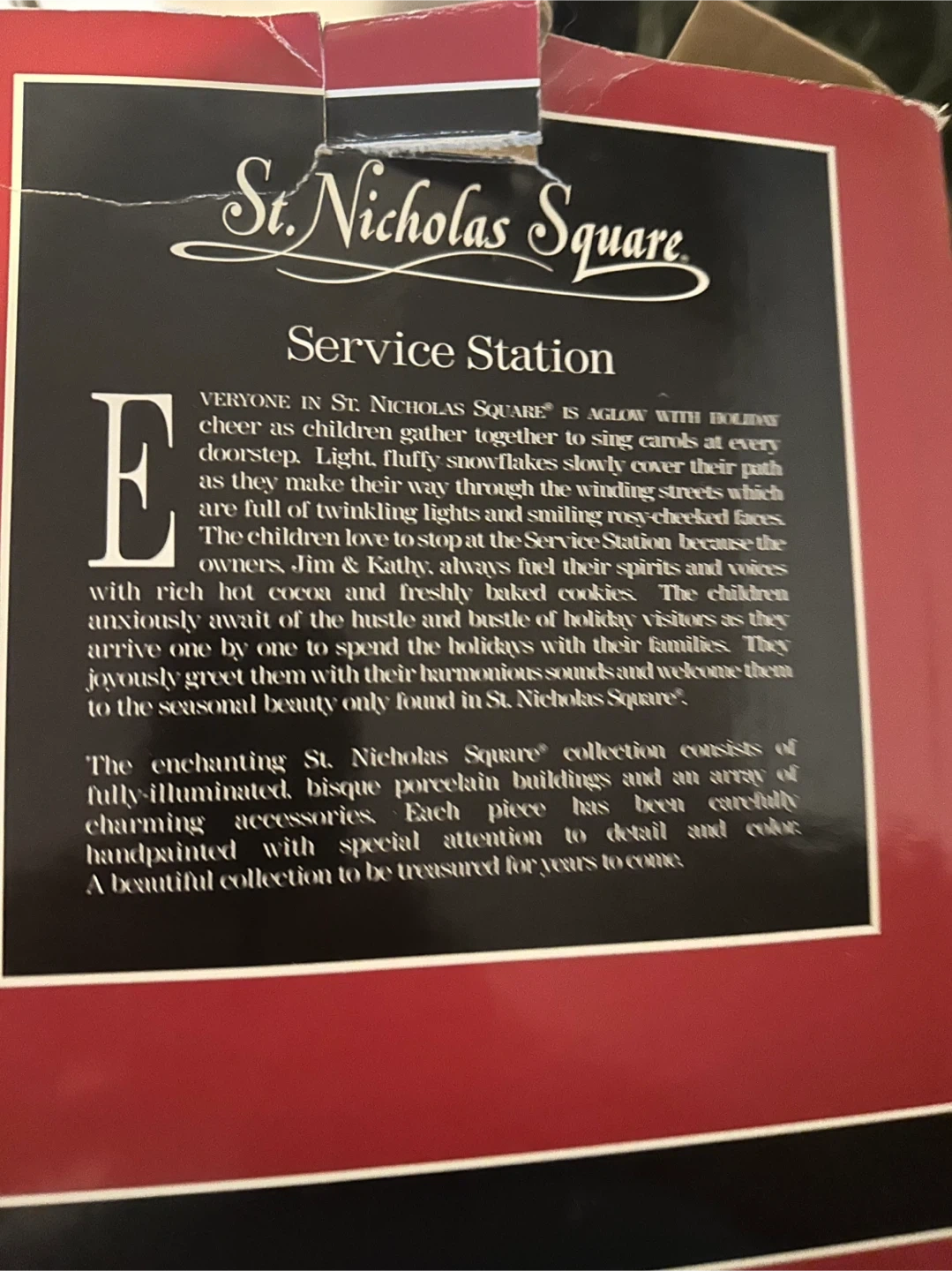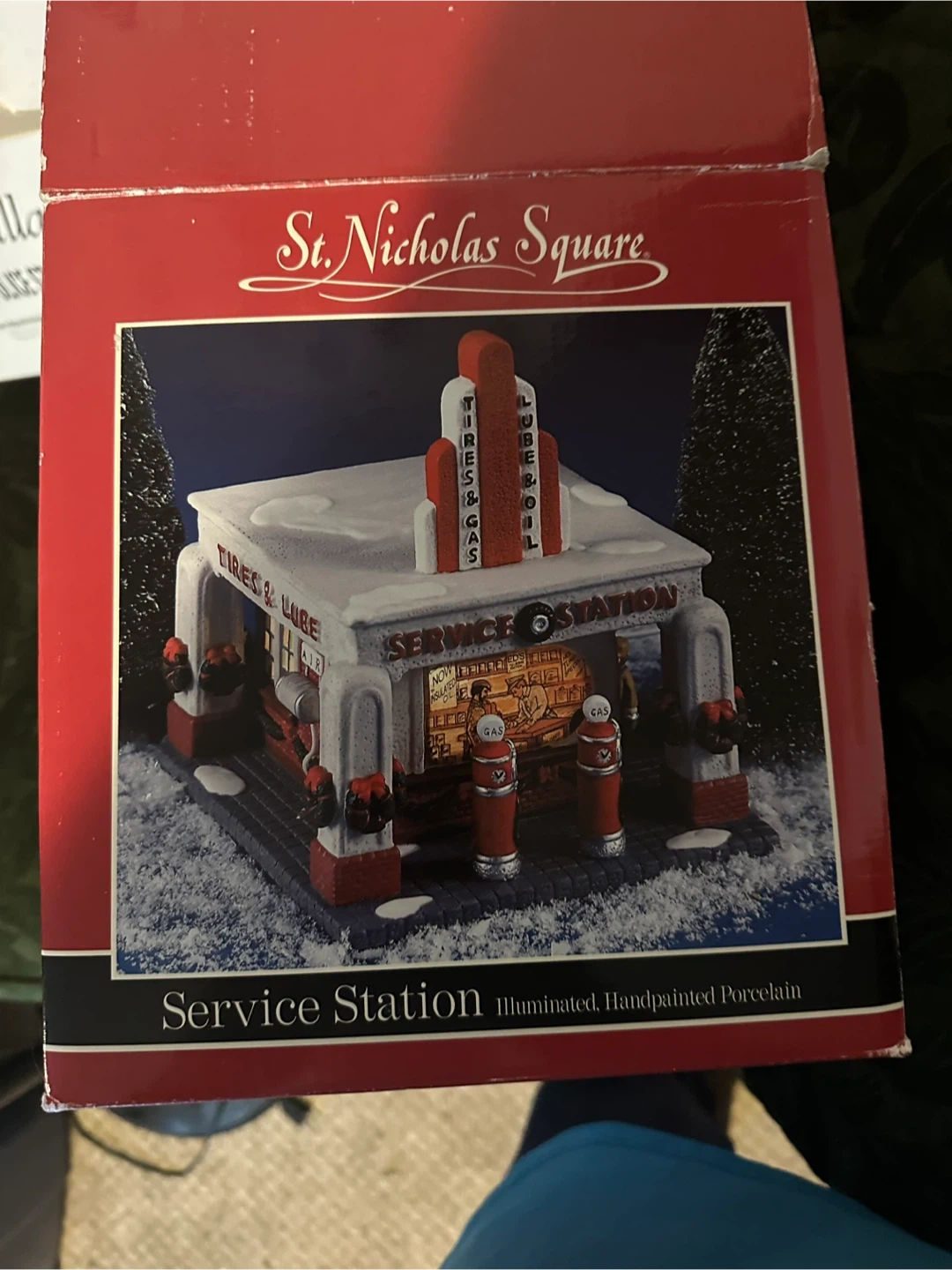 60The St. Nicholas Square Service Station Lighted Christmas Village House is a collectible holiday and seasonal decoration from the 2000s. This Christmas village house, part of the St. Nicholas Square brand, features a festive design perfect for the occasion. With a focus on villages, this illuminated house adds charm and whimsy to any holiday display, making it a beloved addition to any Christmas collection.