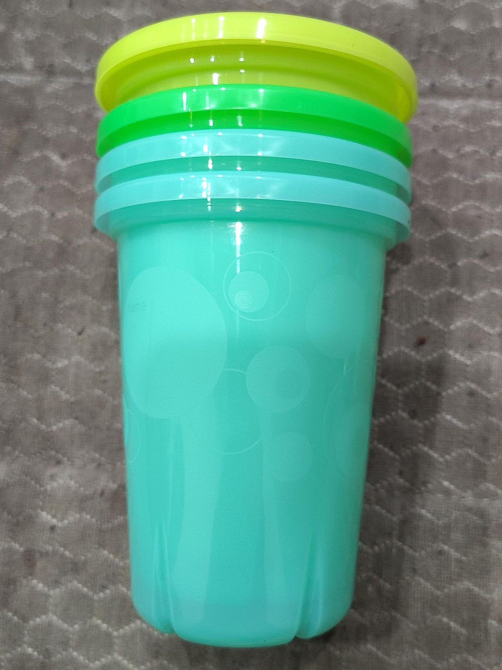 I'm selling a set of stackable plastic cups with lids. They come in a variety of fun colors like green, light green, and a light blue. These cups are perfect for storing snacks or drinks! I have 4 stackable kids cups with lids and straws great for juice and or snacks for younger kids while taking a car ride or a stroll around the block