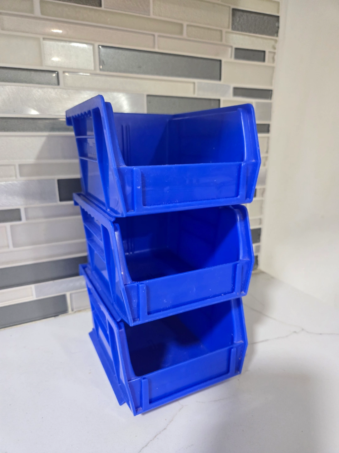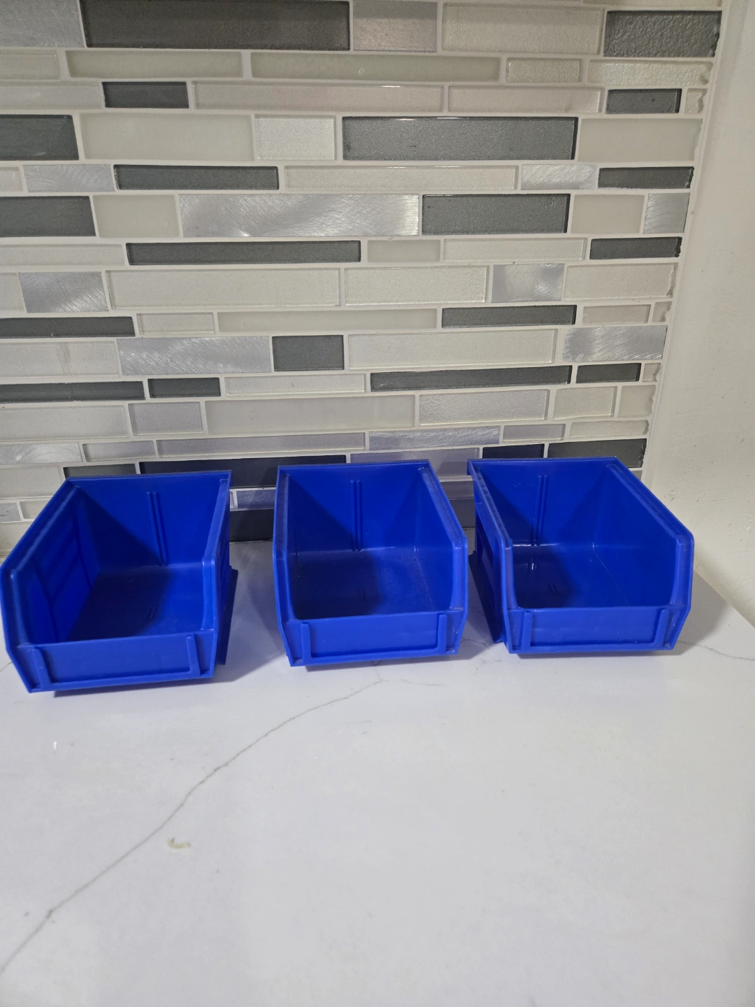 Bright blue storage bins. Each with an open front. Stackable design. These bins can create a more orderly and functional space.