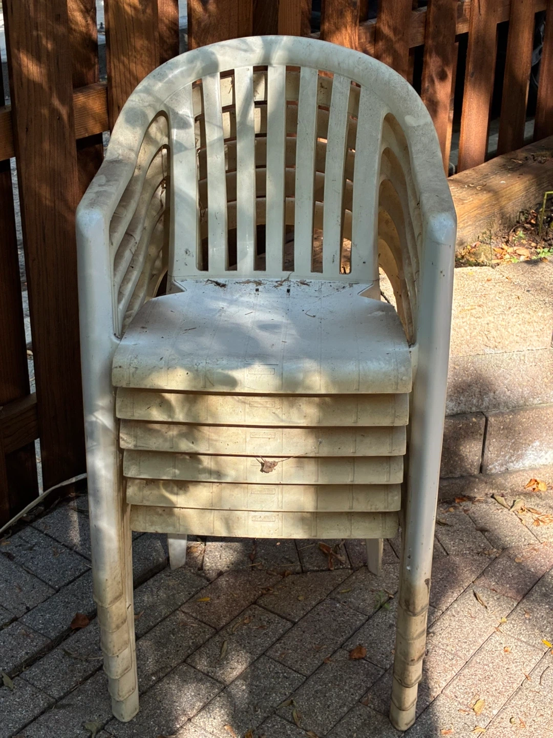 Selling a stack of white plastic chairs. They're perfect for outdoor use and easy to store!