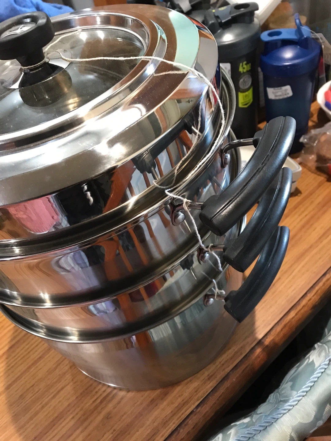 157Selling a stainless steel 3-tier steamer pot. It appears to be in good condition and is perfect for steaming vegetables, dumplings, or seafood. The steamer is made of stainless steel and has black handles. The height is approximately 15 inches. It's a great addition to any kitchen!