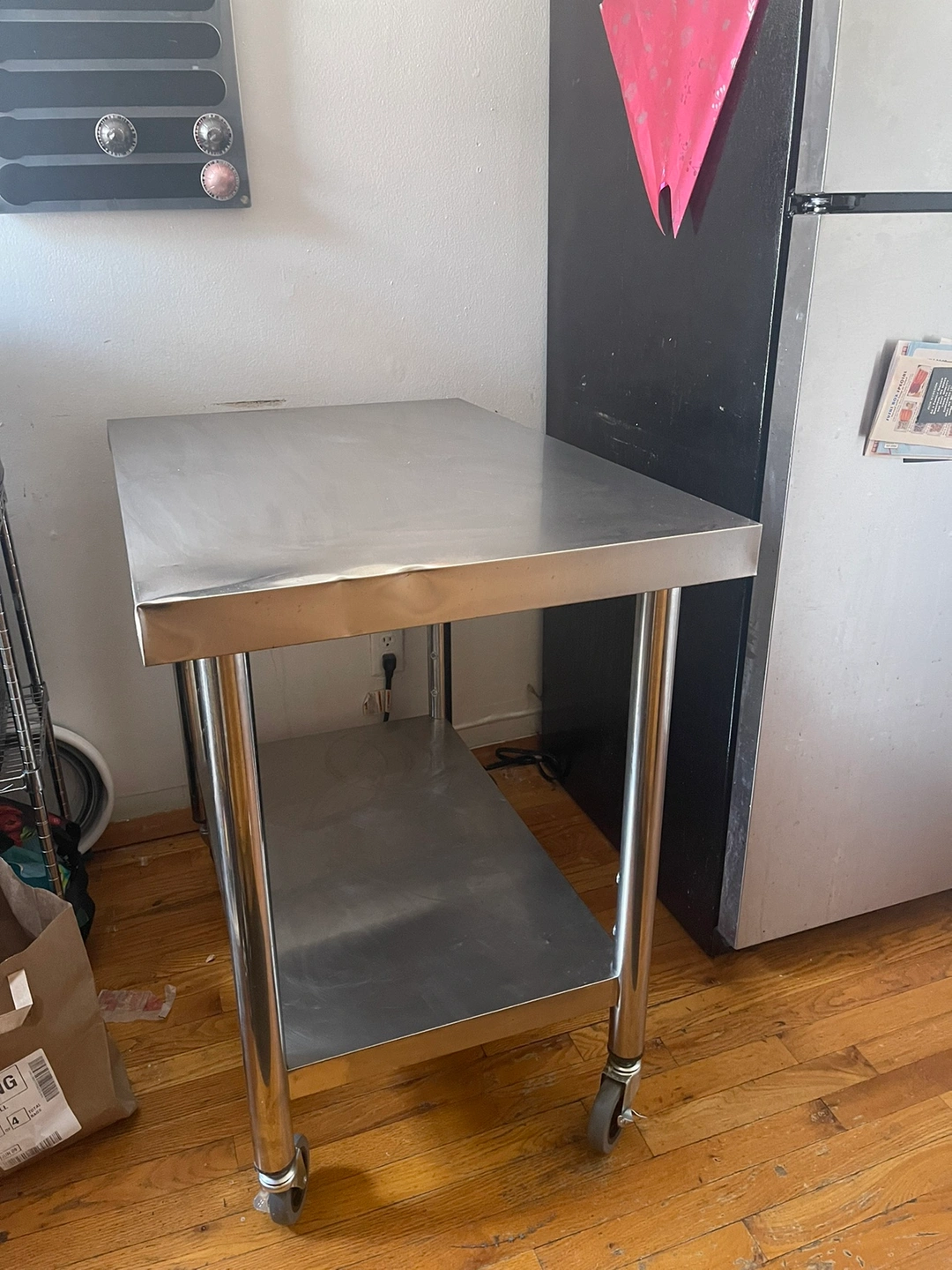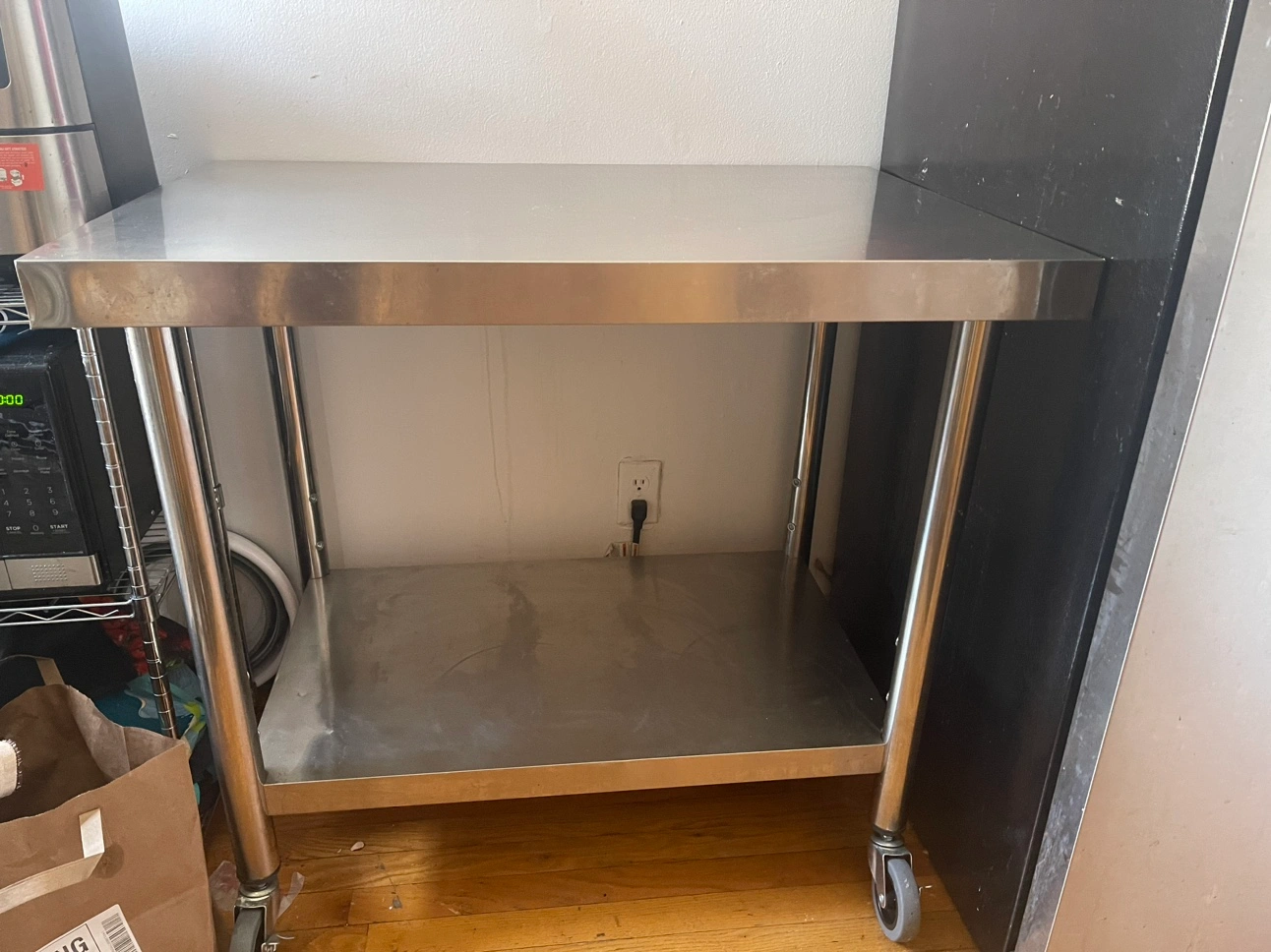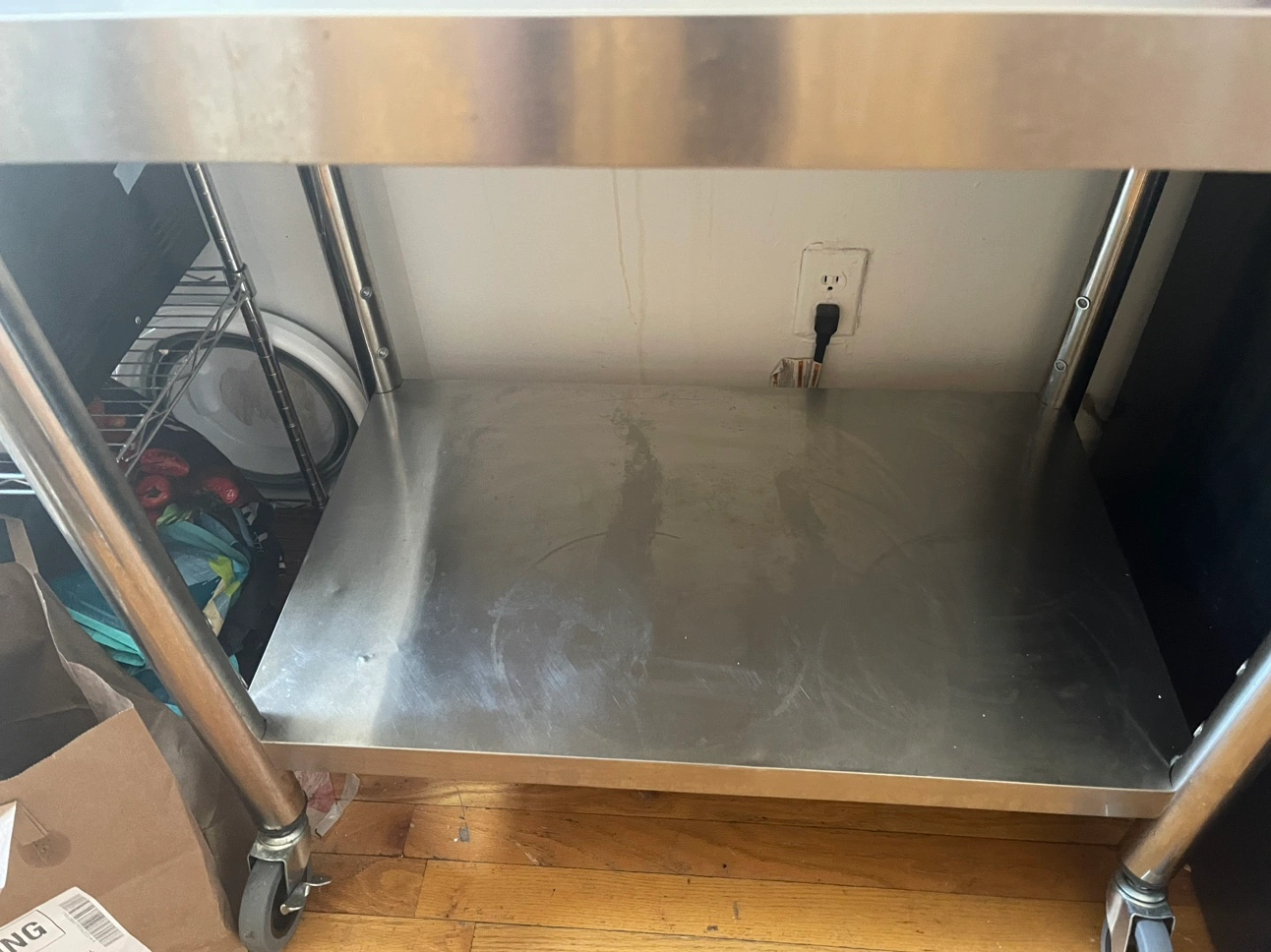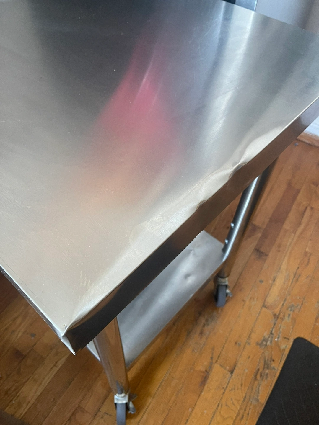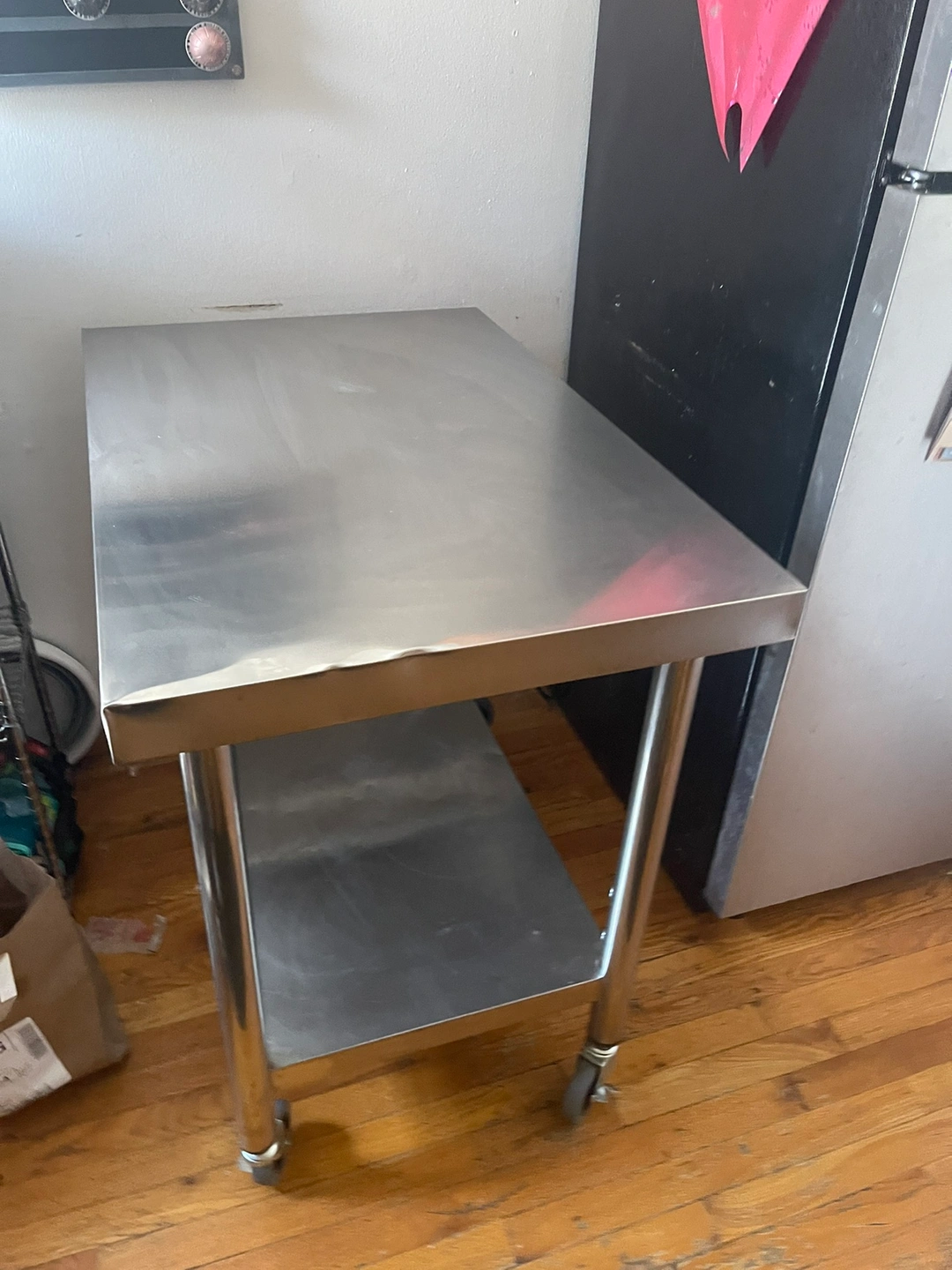 Kitchen prep table. Stainless steel with bottom shelf. You can adjust the bottom shelf to different heights or remove it completely. On four locking wheels. Slight dents on one of the top edges (pictured). And some outlines of where pots used to sit on the bottom shelf. Dimensions: Upper Shelf Load Capacity: 176 lbs / 80 kg Under Shelf Load Capacity: 176 lbs / 80 kg Number of Wheels: 4 Wheel Diameter: 3 in / 7.6 cm Upper Shelf Dimension: 36 x 24 x 2.2 in / 91 x 60 x 5.5 cm Under Shelf Dimension: 29.9 x 18.1 x 1.6 in / 75.9 x 45.9 x 4 cm Distance Between Two Shelves: 15.7-22 in / 40-56 cm Item Dimension: 36 x 24 x 32 in / 91 x 60 x 81 cm Table Legs Diameter: 1.9 in / 4.8 cm Table Legs Thickness: 0.02 in / 0.06 cm Item Weight: 30.9 lbs / 14 kg
