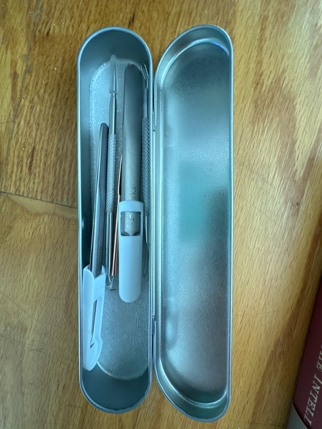 20This is a stainless steel manicure set in a metal case. It looks like it has all the tools you need for a basic manicure. The set includes tweezers, a cuticle pusher, and other tools.