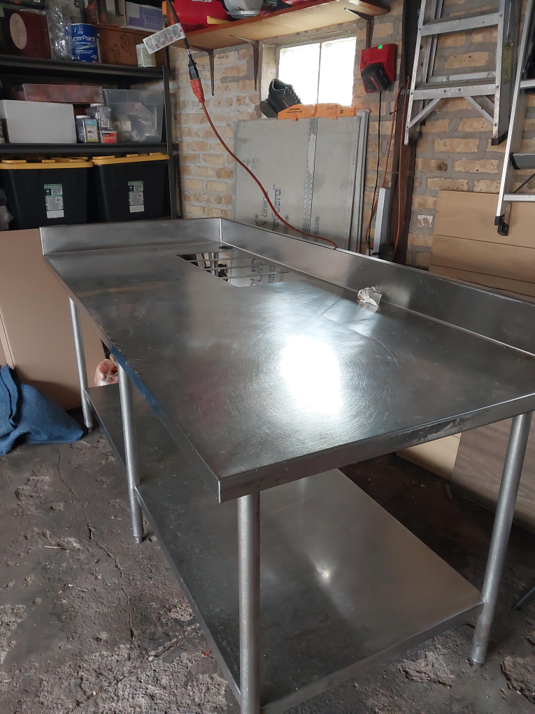 60Selling a stainless steel work table. It has a sink built into the top surface and a shelf underneath for extra storage. Great for a garage, workshop, or kitchen!