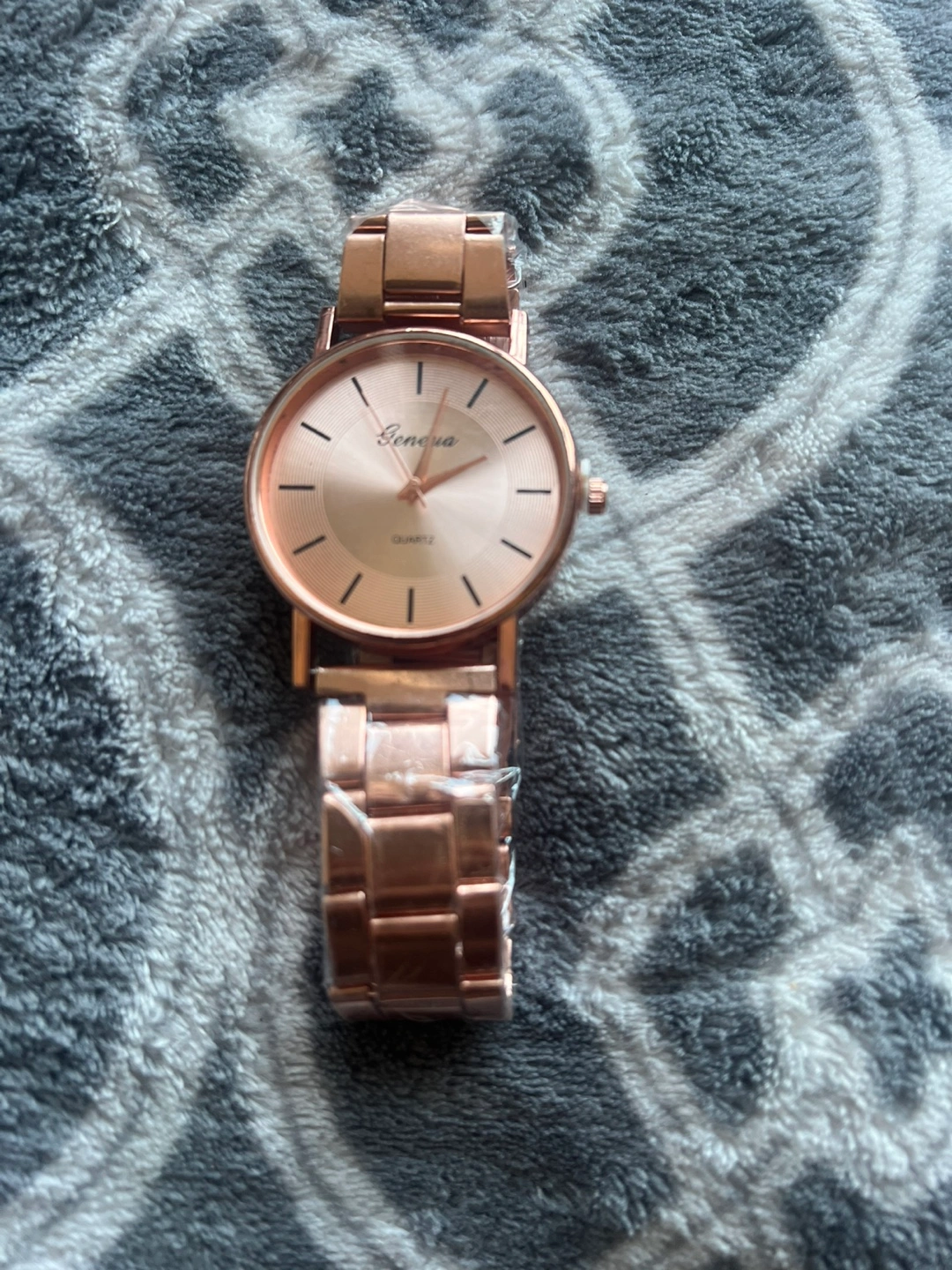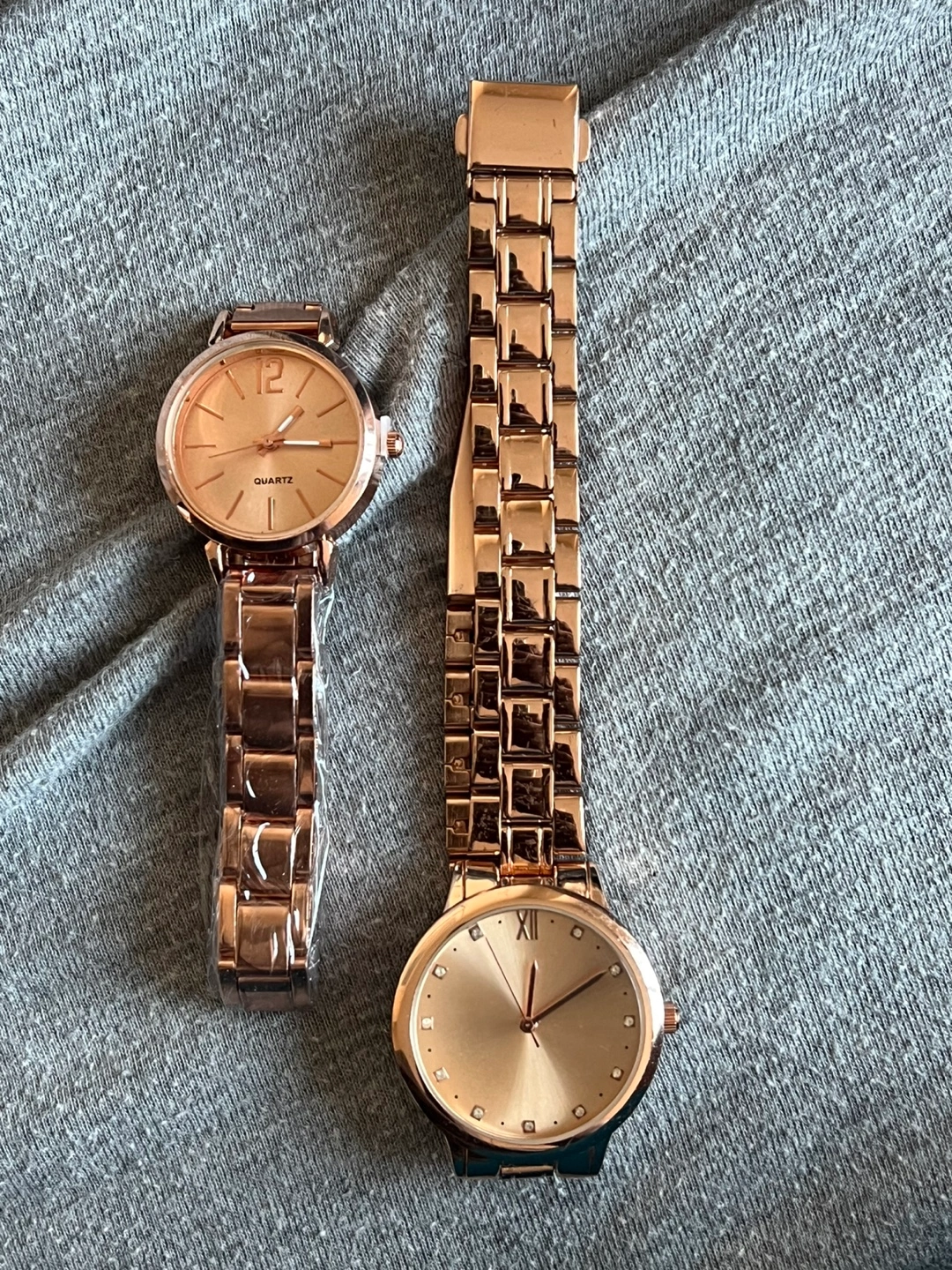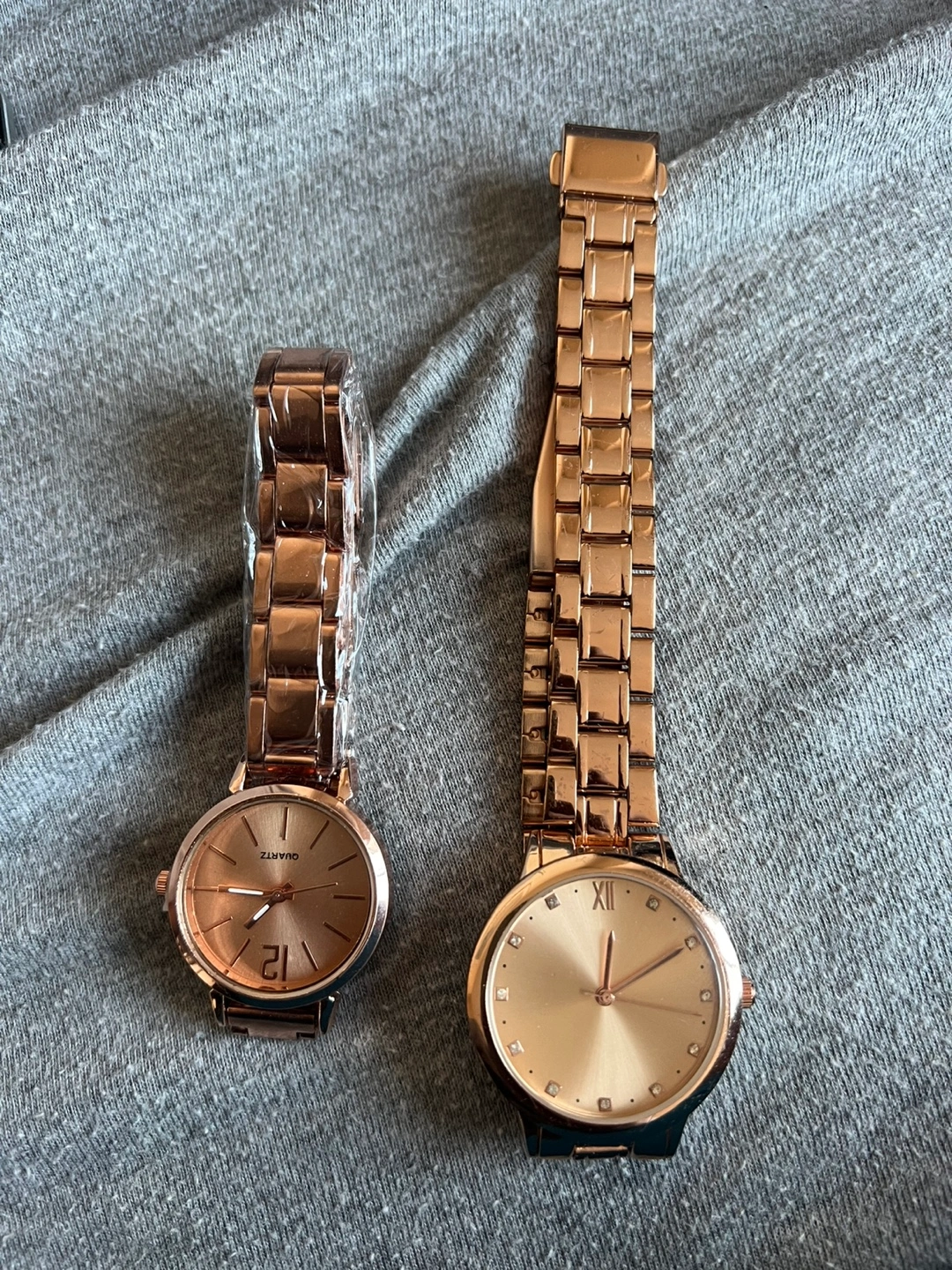 His and Hers Stainless Steel Watched in rose gold! It's in great condition and ready to add a touch of elegance to your wrist